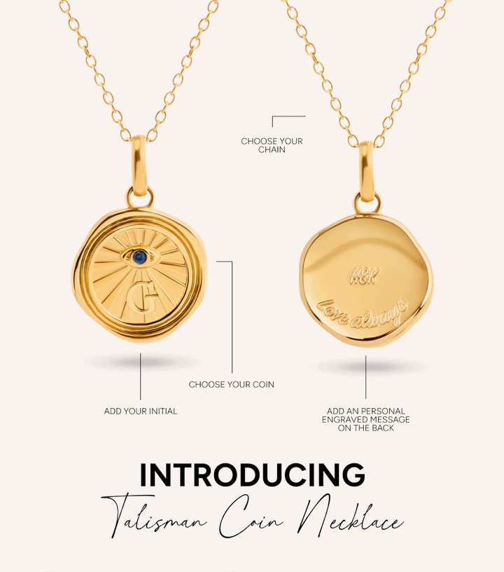 This Custom Talisman Coin Necklace by Abbott Lyon is an ultra-personalized piece designed to manifest your dreams. Choose a meaningful symbol—like the clover for luck or the sun for new beginnings—each paired with a corresponding semi-precious stone to guide your journey. You can further customize this piece with a custom-welded initial on the front and an engraved name or inspiring mantra on the back. Every time it catches the light, this necklace serves as a powerful, one-of-a-kind reminder of your inner strength and personal journey.