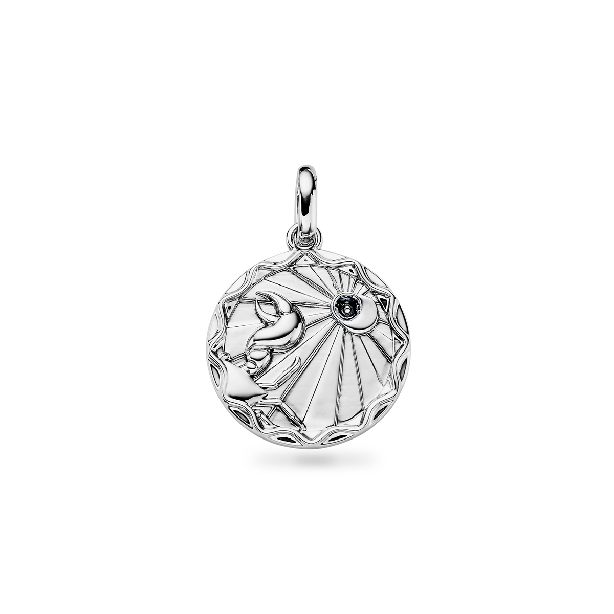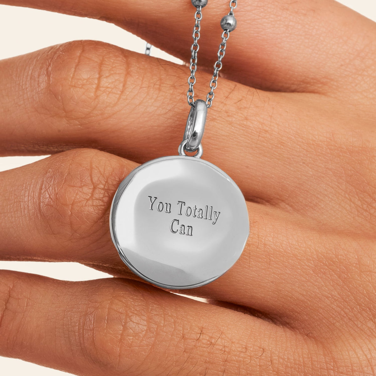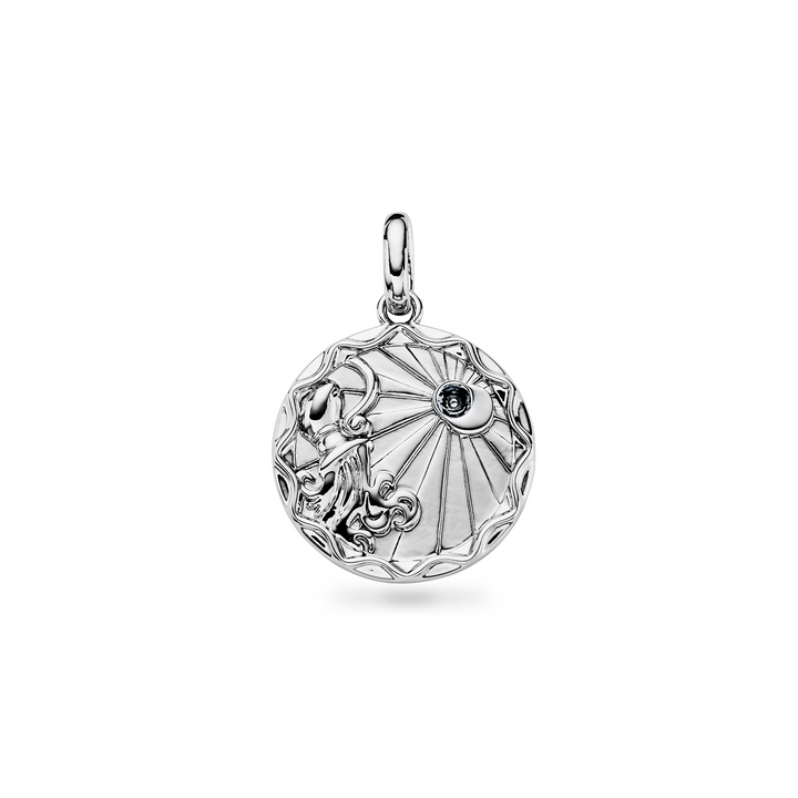 This necklace is crafted from silver-plated brass with a 20mm pendant and a 3mm cubic zirconia birthstone. It features an innovative anti-tarnish protective coating, is water, sweat, and heat-resistant, and is made from over 60% recycled materials. It is available in three chain lengths (14-16 in, 18-20 in, and 22-24 in) and three chain options: Fine, Sphere, and Rope.