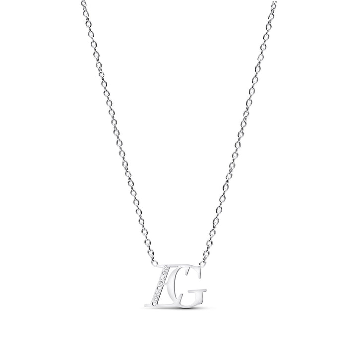 This necklace is crafted from polished stainless steel and features clear cubic zirconia crystals. It has an innovative anti-tarnish protective coating, is water, sweat, and heat-resistant, and is made from over 60% recycled materials. The necklace is available in three chain lengths (14-16 in, 16-18 in, and 18-20 in). The initials have a height of 10mm.