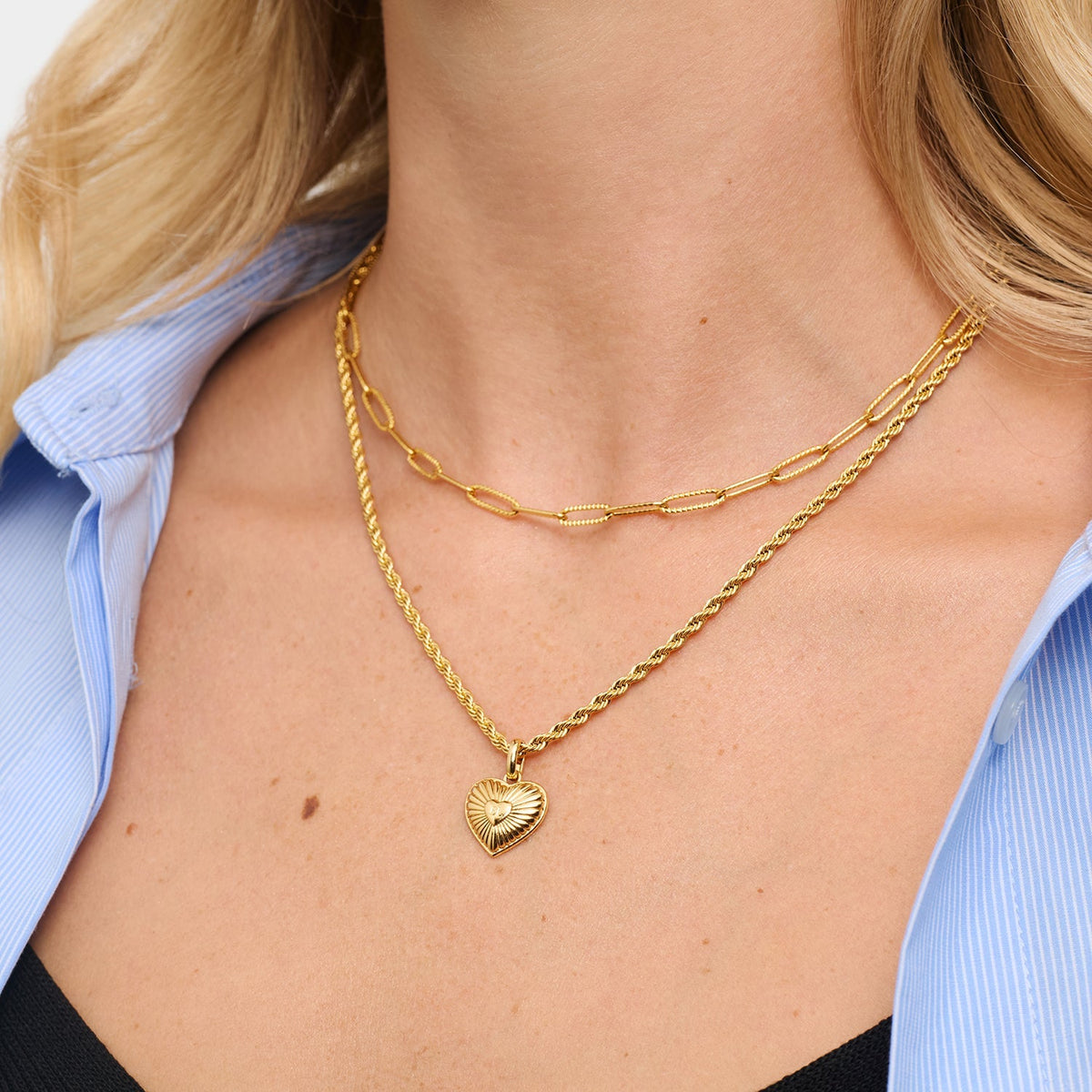 This necklace is crafted from 18k gold-plated brass with a 16.5 x 15.5mm pendant. It features an innovative anti-tarnish protective coating, is water, sweat, and heat-resistant, and is made from over 60% recycled materials. Engraving is available on the reverse side of the pendant.