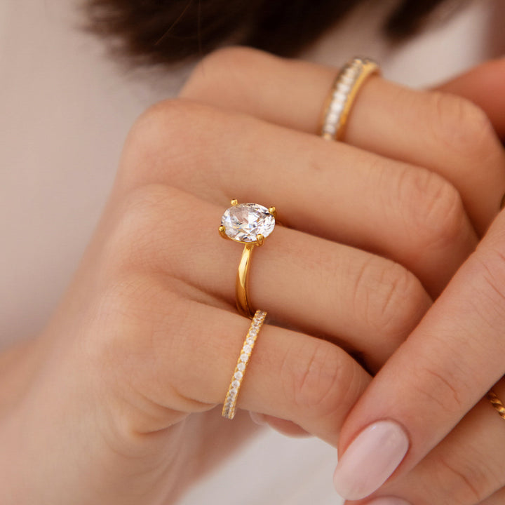 This ring is crafted from 18K gold-plated sterling silver with 2mm 5A Cubic Zirconia gemstones. It features an innovative anti-tarnish protective coating, is water, sweat, and heat-resistant, and is made from over 90% recycled materials. The ring is available in six sizes: J, K, L, M, N, and P.