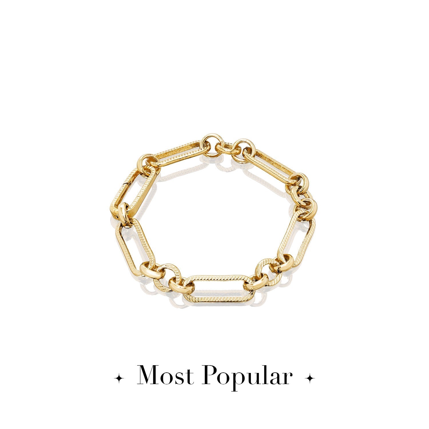 The Figaro Chain Bracelet by Abbott Lyon features a chunky, yet classic, Figaro chain design that makes a bold statement on its own or a perfect base for a layered look. The seamless clasp allows you to easily add your favorite charms and pendants for a truly bespoke piece. This bracelet is an ideal accessory for adding a touch of edgy elegance to any outfit.