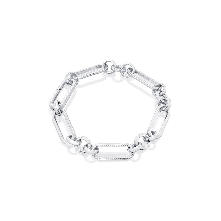 This bracelet is made from luxury silver-plated brass with an 8mm thickness. It is expertly plated for long-lasting durability, water, sweat, and heat-resistant, and comes with a two-year quality guarantee. It is available in two adjustable chain lengths: 7.5 inches (S/M) and 8.5 inches (M/L).