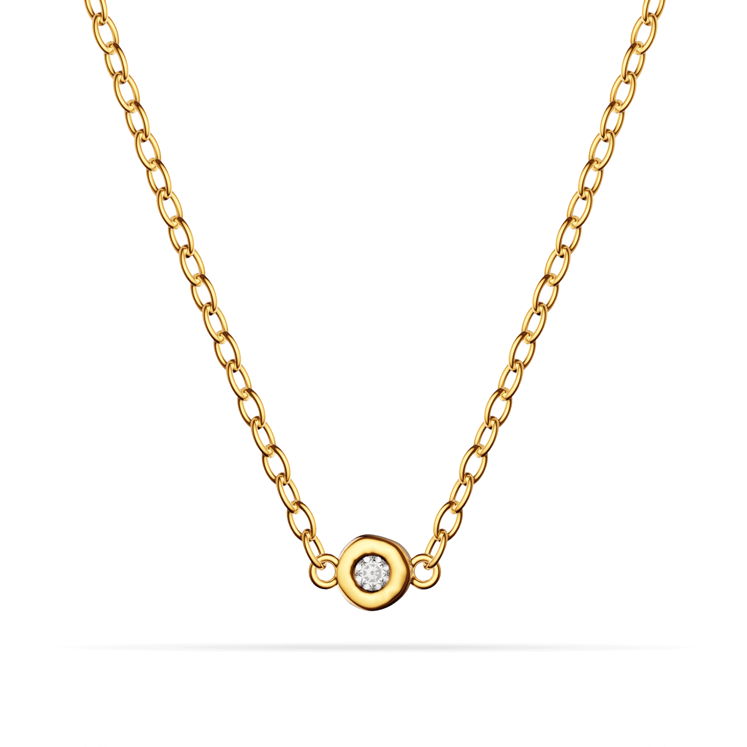 This necklace is crafted from 18k gold-plated sterling silver with semi-precious gemstone birthstones. It features an innovative anti-tarnish protective coating, is water, sweat, and heat-resistant, and is made from over 90% recycled materials. The charm measures 4.5mm and the chain is adjustable from 16 to 18 inches. It comes with a five-year quality and plating guarantee.