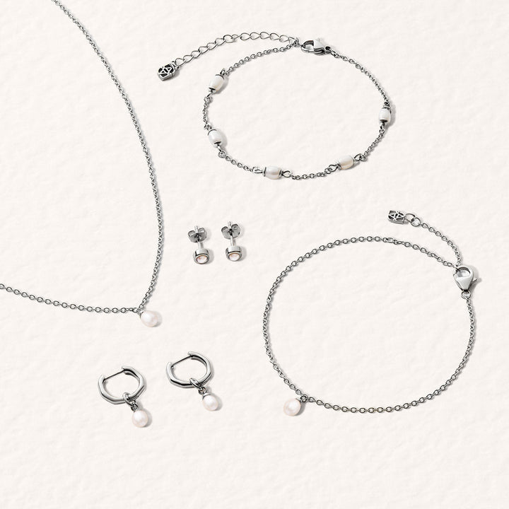 This bracelet is crafted from rhodium-plated sterling silver with a 5mm organic freshwater pearl. It is water, sweat, and heat-resistant, and is made from over 90% recycled materials. The chain is adjustable from 7 to 9 inches and comes with a five-year quality and plating guarantee.