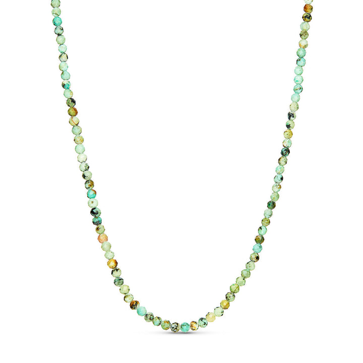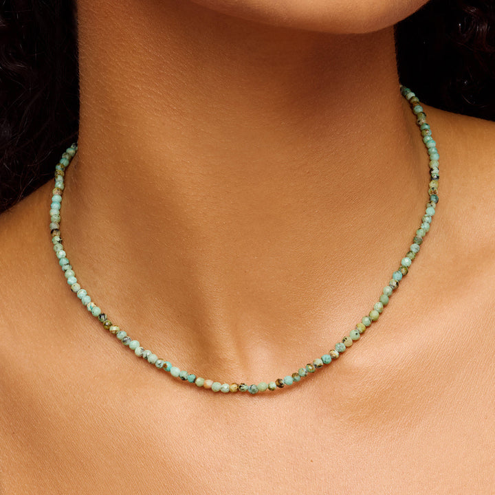 The Green Turquoise Beaded Necklace (Gold) combines laid-back style with luxury. Made with semi-precious green turquoise stones, known for their calming energy and good vibes, this necklace features gold-plated accents and our signature shine. It's a versatile piece that can be worn solo or layered for an elevated look.