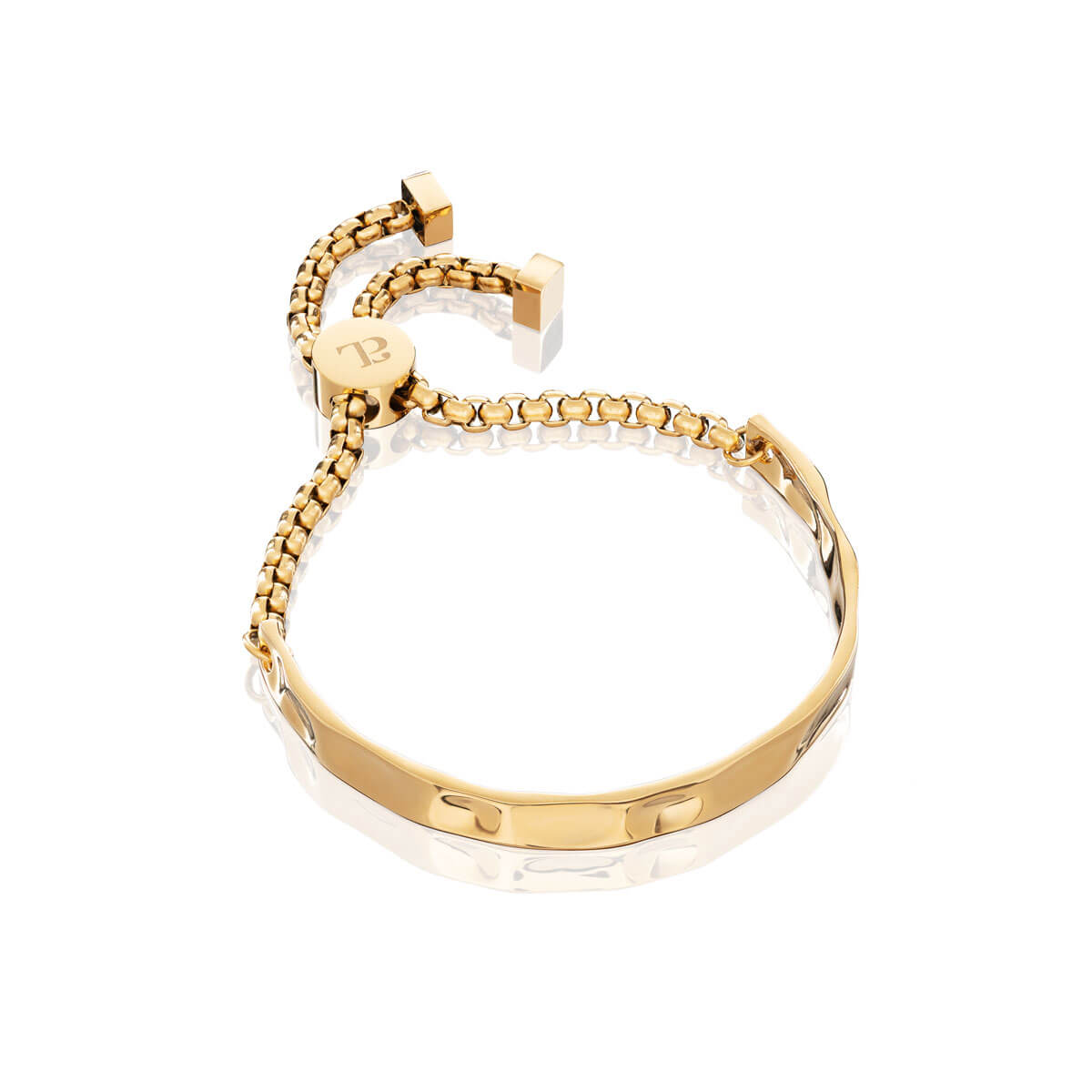 This bangle is crafted from 18k gold-plated stainless steel and brass. It is water, sweat, and heat-resistant, and made from over 60% recycled materials. The chain is adjustable up to 7.5 inches, with a thickness of 7mm. It comes with a two-year quality and plating guarantee.