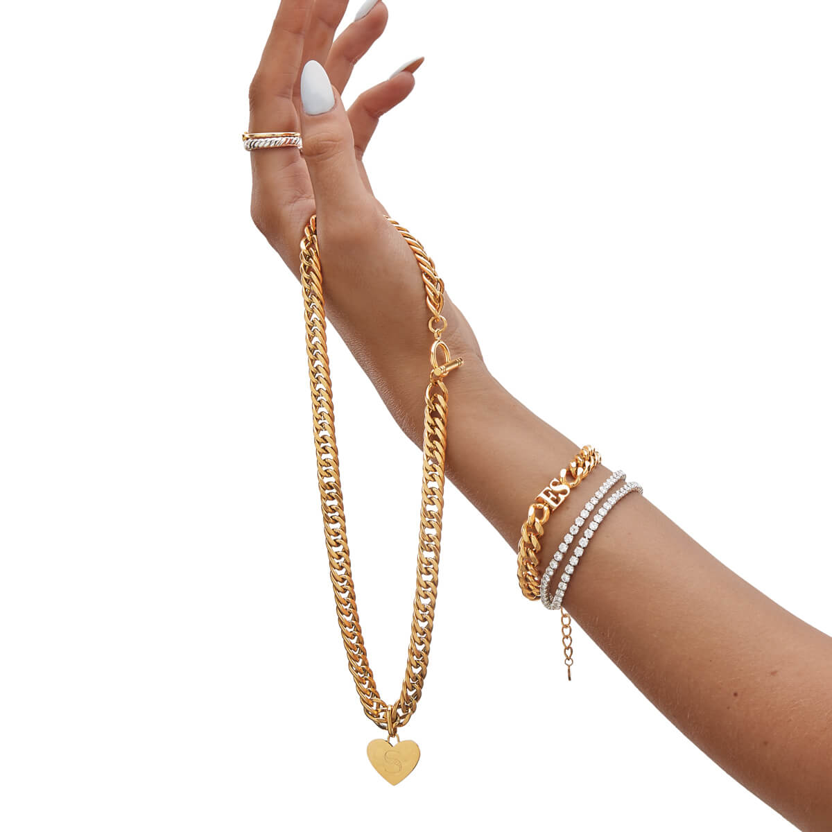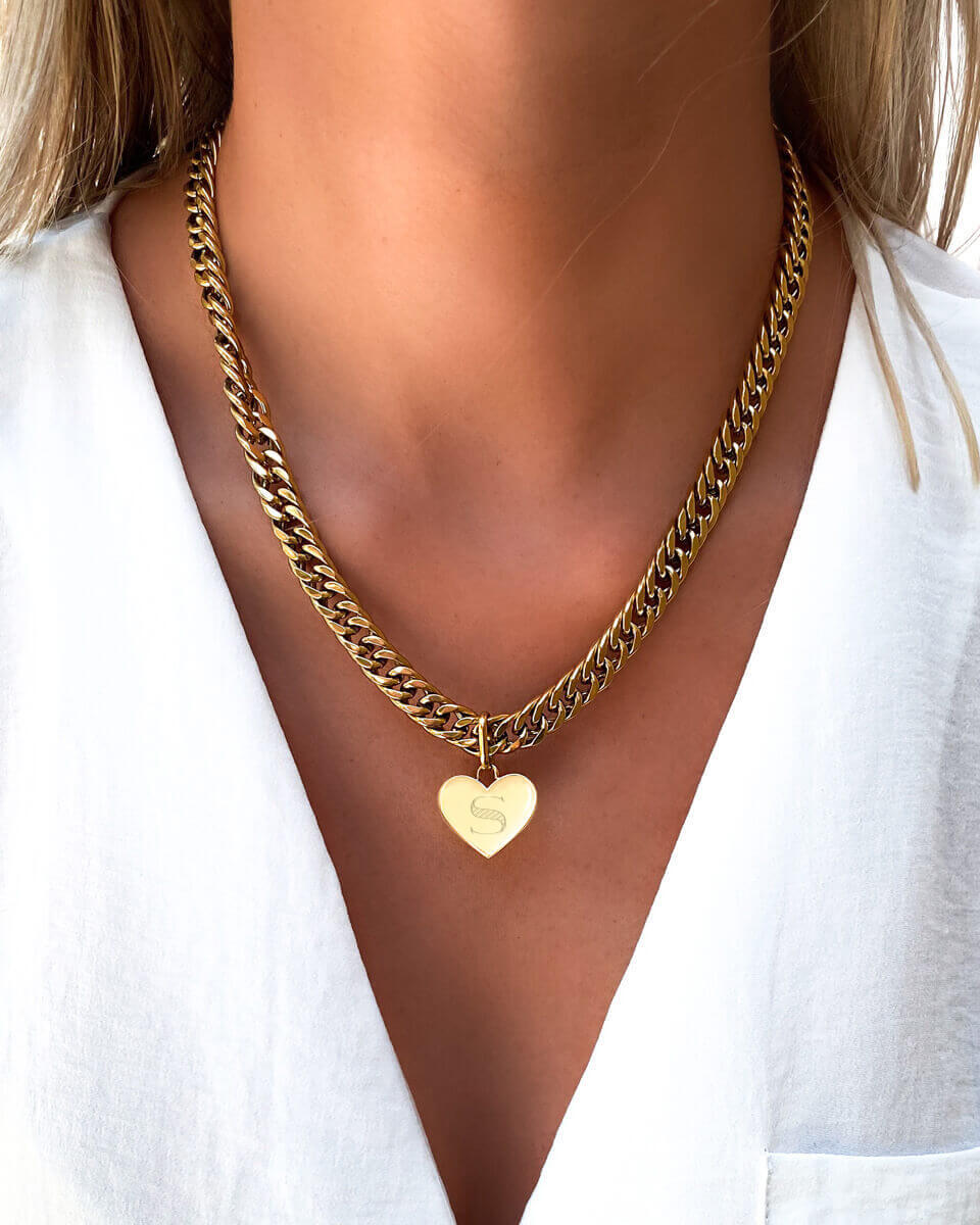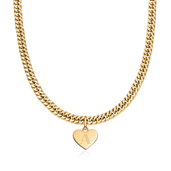 The Heart Curb Chain Necklace (Gold) is a perfect statement piece that adds a touch of glam to your everyday style. You can make it personal by engraving an initial on the heart pendant, creating a luxury personalized gift.