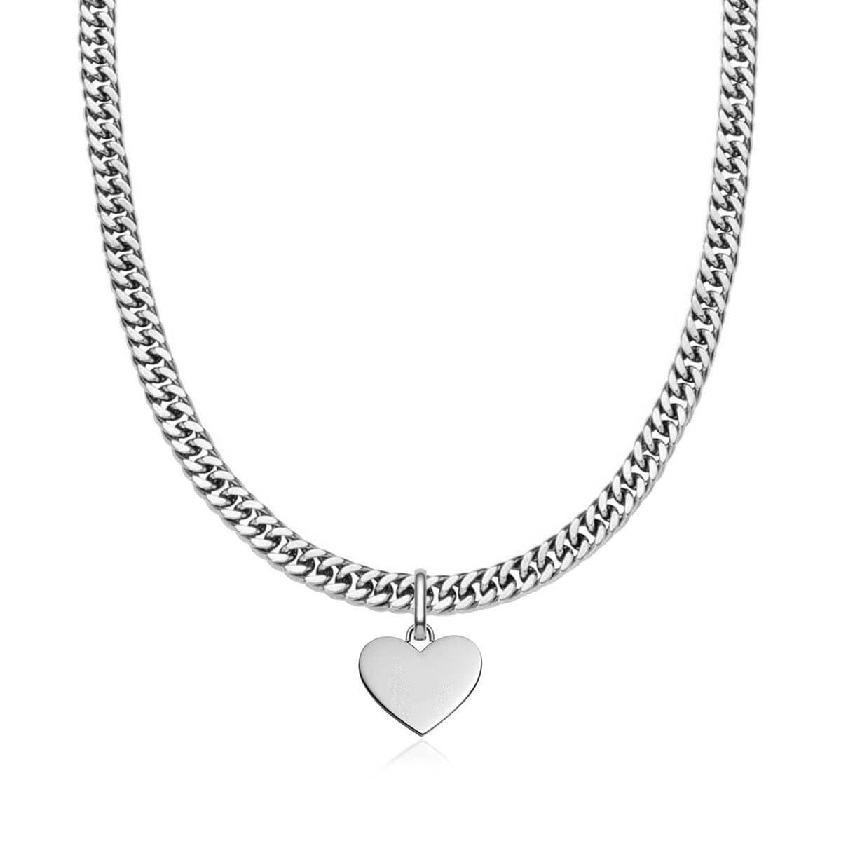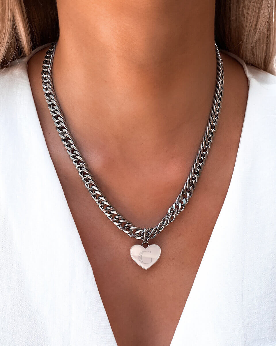 The Heart Curb Chain Necklace (Silver) is a super luxe piece with a mix of femme and edgy style. It adds a touch of glam to your everyday look, and the heart pendant can be engraved with an initial for a personalized touch, making it a special gift.