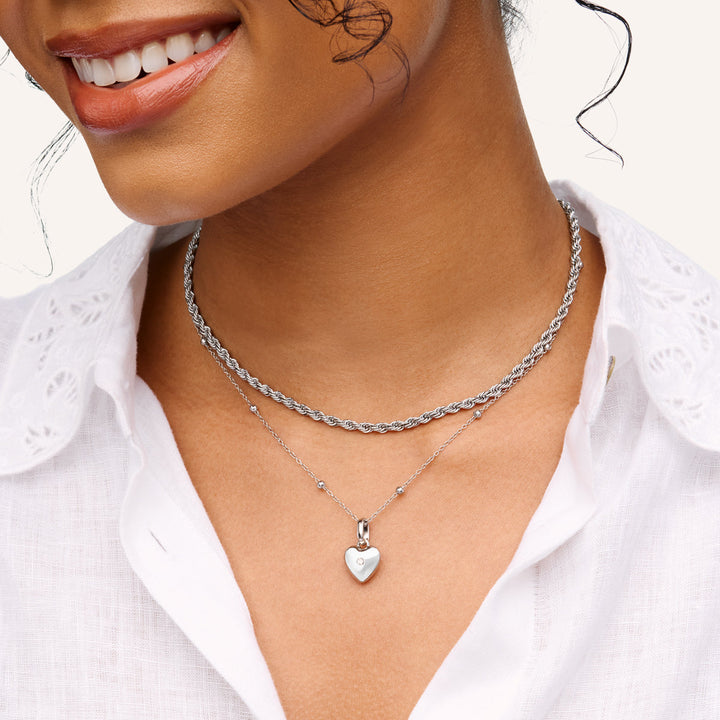 This necklace is made from silver-plated brass with clear cubic zirconia. It is water, sweat, and heat-resistant, and made from over 60% recycled materials. The pendant measures 11mm, and the necklace is available in three lengths: 14-16 inches, 16-18 inches, and 18-20 inches. It comes with a two-year quality and plating guarantee.