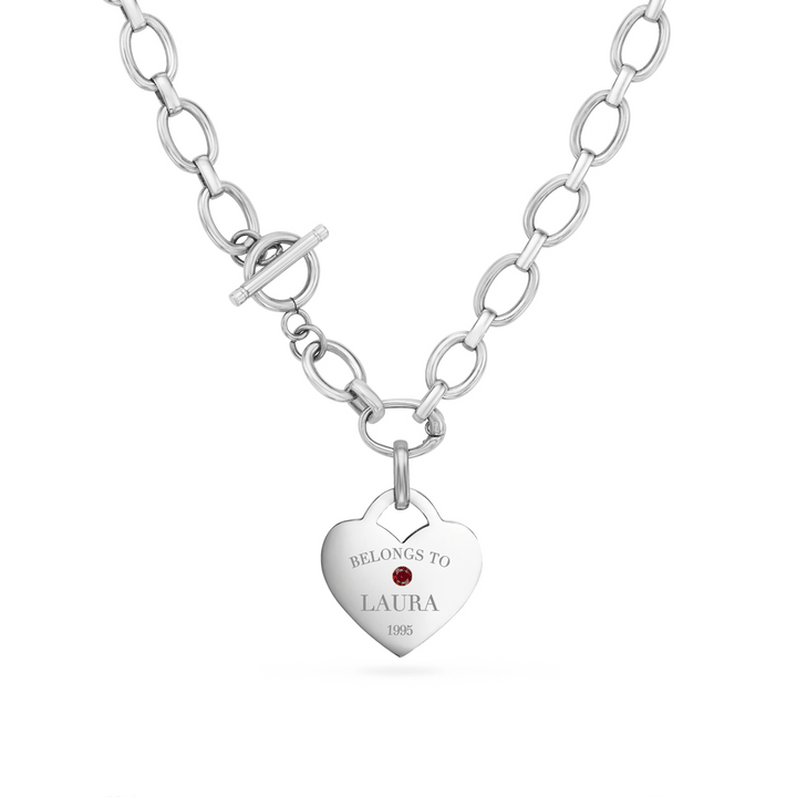 The Heart Token Oval Necklace (Silver) is a bold statement piece with a classic twist. It features an oversized heart pendant, a sleek oval-shaped chain, and a toggle clasp, making it perfect for layering. You can make it even more personal by adding an engraving and the birthstone of your choice, creating a perfect gift for someone special or yourself.