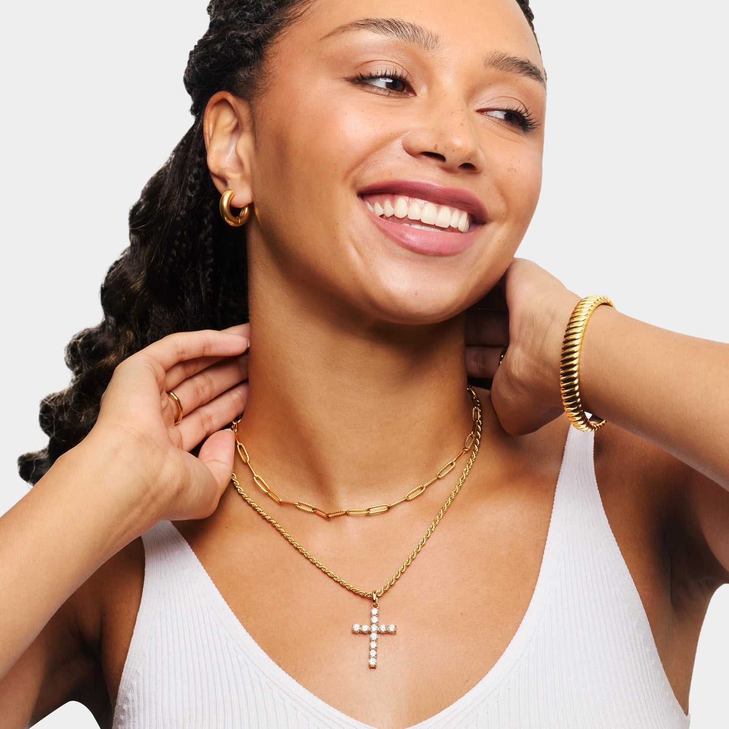 This La Croix Crystal Cross Pendant by Abbott Lyon, from the Entwine Collection, is a piece to be cherished. Whether it represents faith, peace, inner strength, or simply an elegant sense of style, this luxury necklace is a beautiful statement piece. The designer-inspired rope texture adds an elegant twist to the classic cross design, while the clear cubic zirconia gems add a subtle touch of glamour, making it a perfect piece for both everyday wear and special occasions.