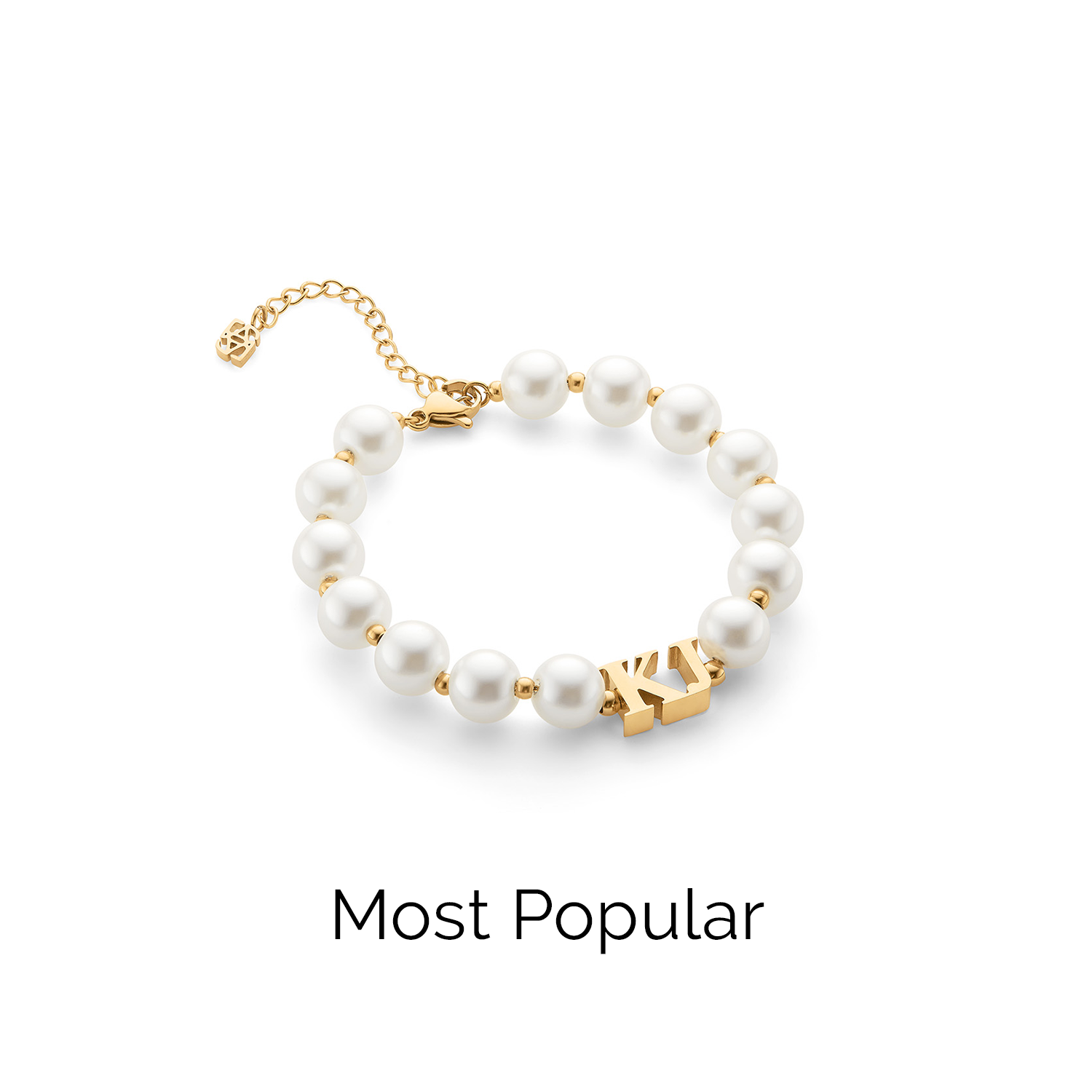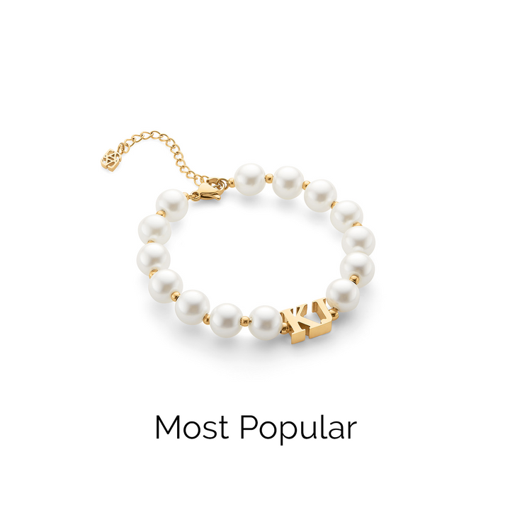 Handcrafted in 18k gold-plated stainless steel with an 8mm faux pearl and a personalized initial. Available in two chain lengths: S/M (6-7.5in) and M/L (7.5-9in).