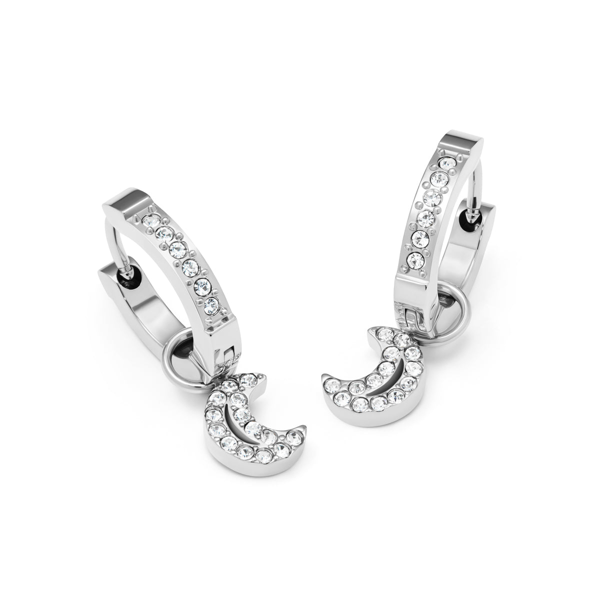 Handcrafted in platinum-plated stainless steel with a 7mm moon and a 13.5mm outer diameter huggie hoop. They feature clear round cubic zirconia gems.