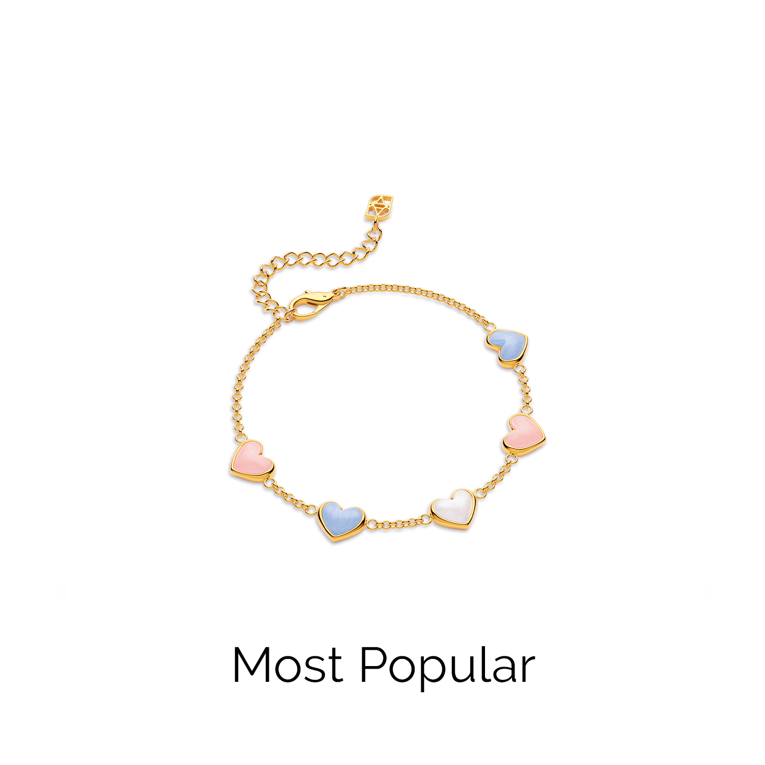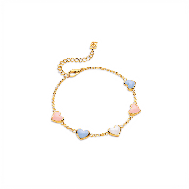 This Multi Heart Bracelet by Abbott Lyon is a luxurious piece that adds a touch of love to your collection. It features three meaningful semi-precious stones: white quartz for harmony, blue lace agate for emotional balance, and pink opal for protection. The dreamy mix of pastel shades makes this a perfect gift. Note that the stones are natural and may have slight variations in color.