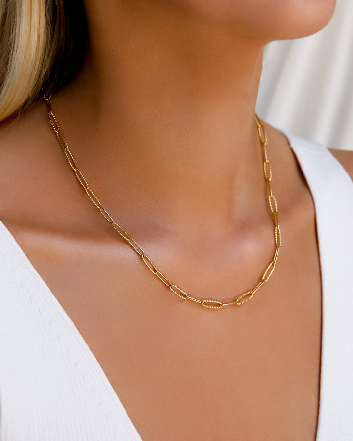 This Paperclip Chain Necklace by Abbott Lyon is a gorgeous addition to the necklace collection, perfect for layering to add a premium finish to any outfit. This statement-link chain has a refined design that looks stunning when worn alone or styled with other chains and pendants for a super luxe look.