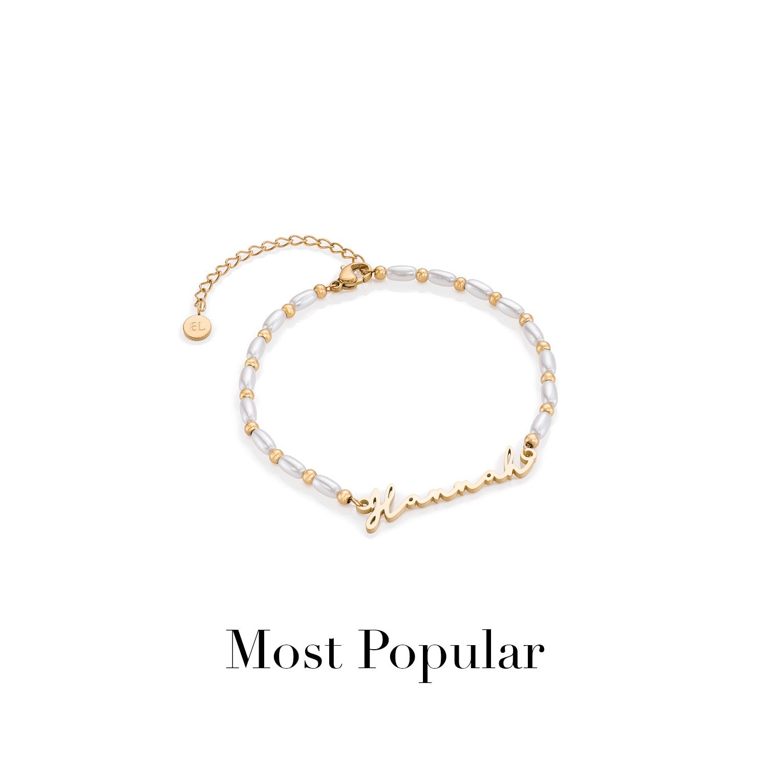 This Pearl Chain Signature Name Bracelet by Abbott Lyon adds a romantic touch to your look. This stunning and unique piece features a beautiful mother of pearl finish and can be customized with a name to create a designer-inspired, bespoke bracelet that celebrates you or makes the perfect gift for someone special.
