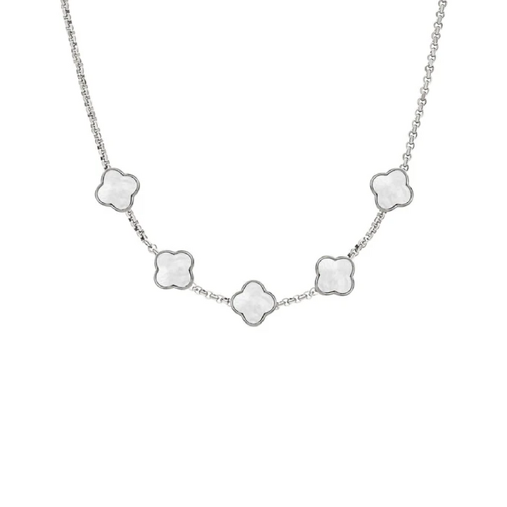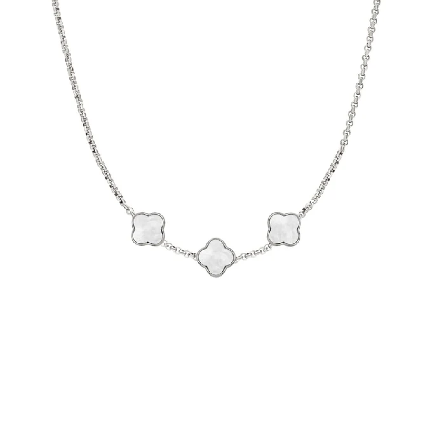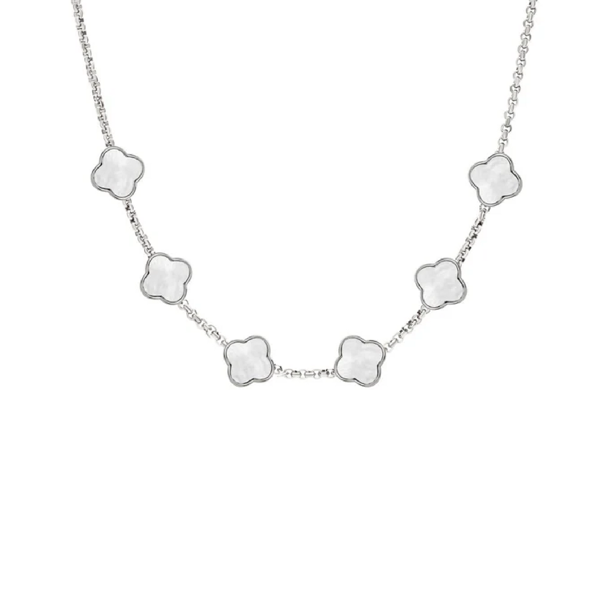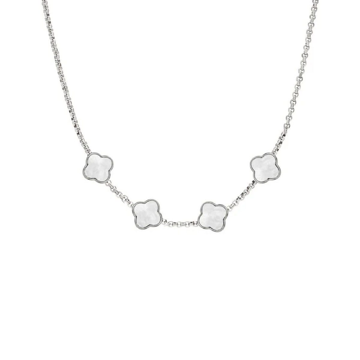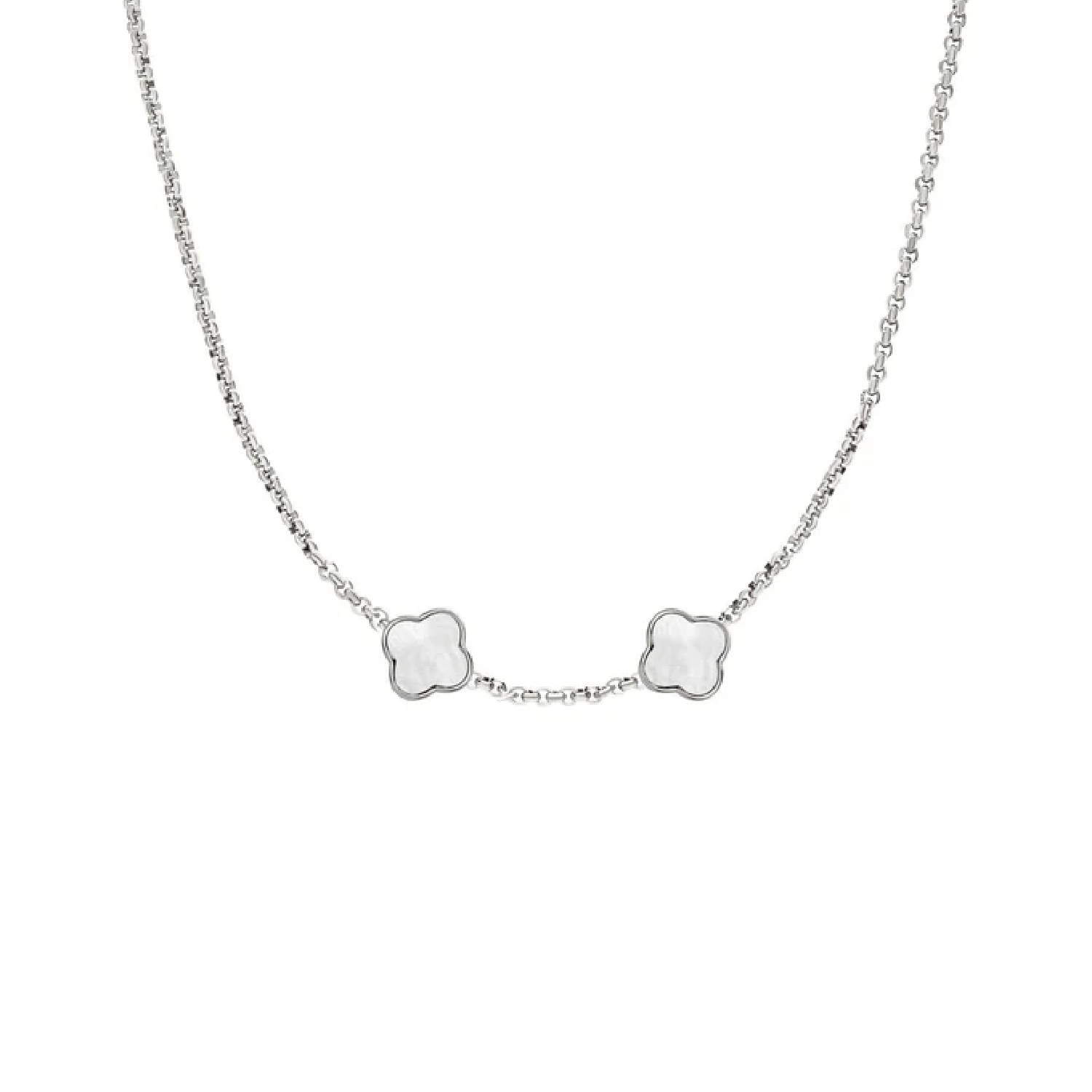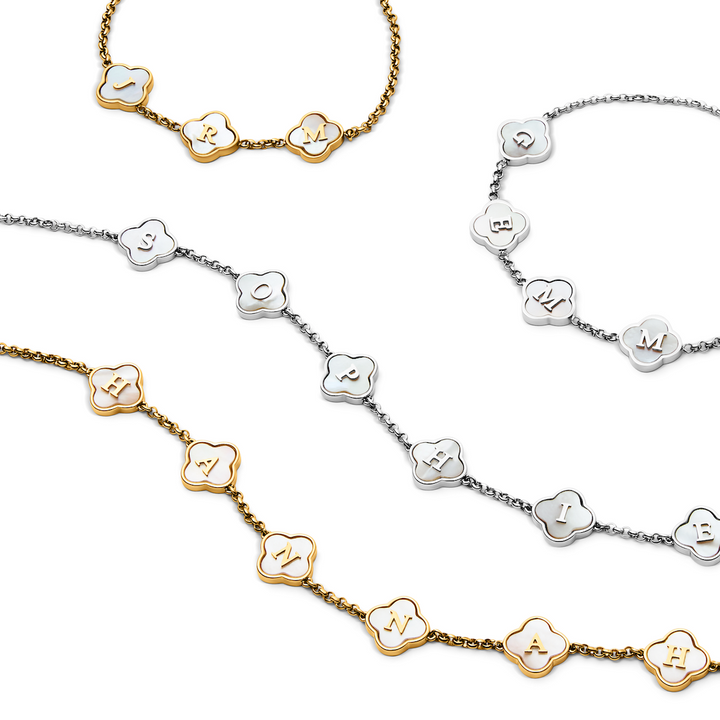 This Pearl Clover Custom Name Necklace by Abbott Lyon is a perfect personalized accessory with a gorgeous mother of pearl finish. You can complete it with the initials, birthstones, or icons of your choice, and it's perfect for stacking with other necklace chains to create a layered look.
