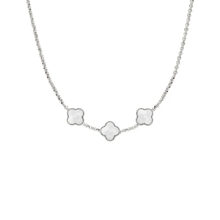 Handcrafted in polished stainless steel with a 12mm clover and 4mm initial. It is available in three chain lengths: 14-16in, 16-18in, and 18-20in.