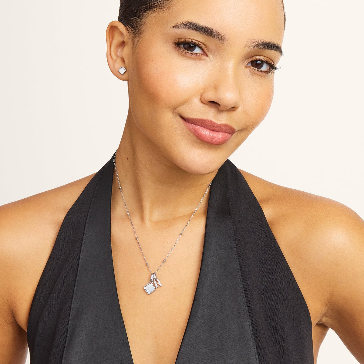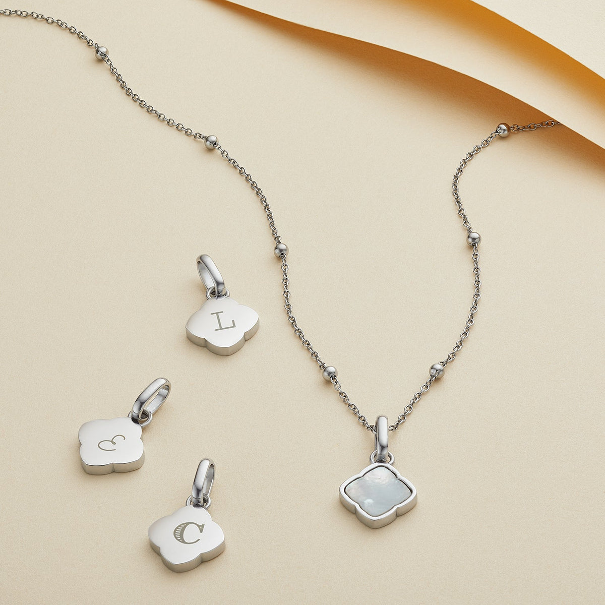 This Pearl Clover Pendant by Abbott Lyon is a stunning silver charm that shows off the beloved clover shape with a pretty mother of pearl inlay. It looks beautiful on its own or grouped with your other favorite charms.