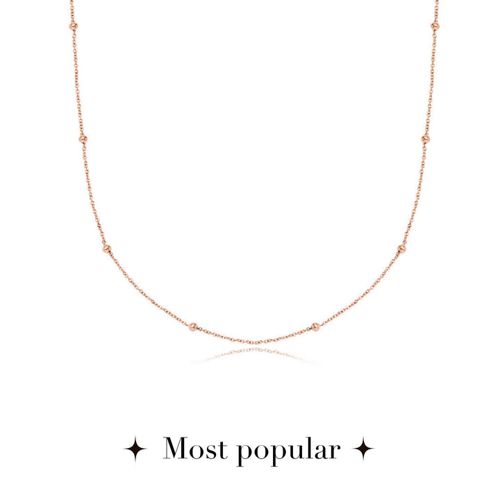 Handcrafted in 18k rose gold-plated stainless steel. It is available in three chain lengths: 14-16in, 18-20in, and 22-24in.