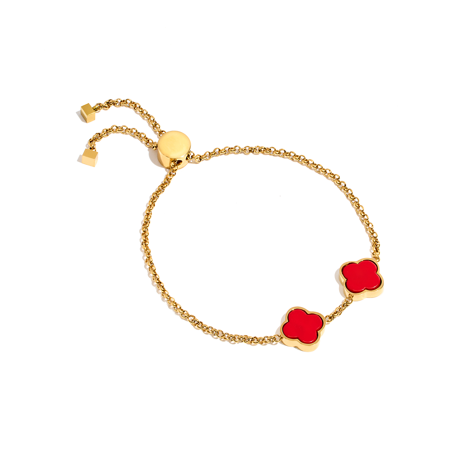 Handcrafted in 18k gold-plated stainless steel with red glass clovers. It has a fully size-adjustable toggle (up to 9.8in).