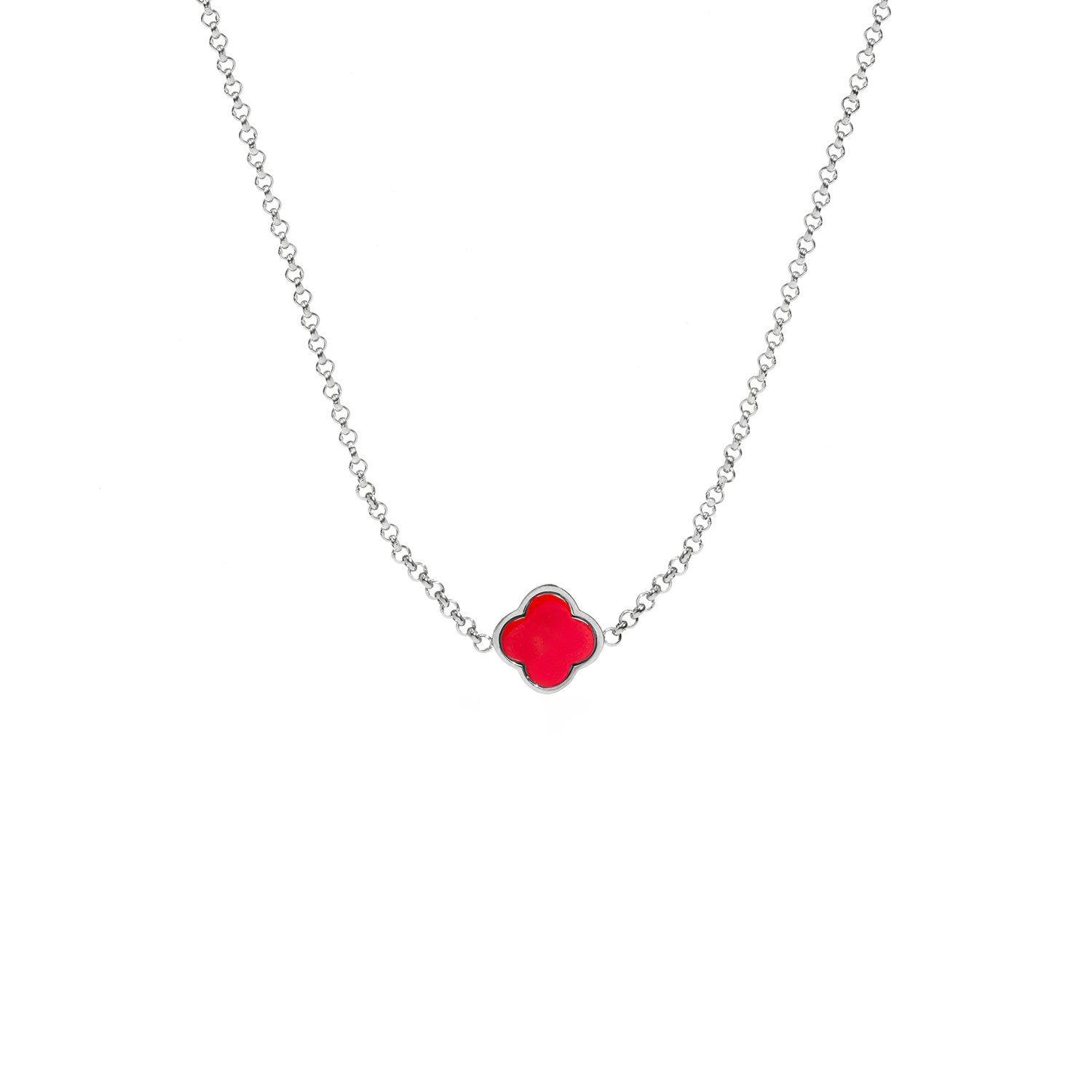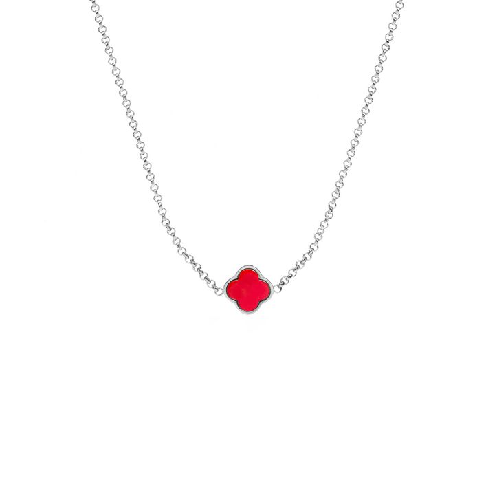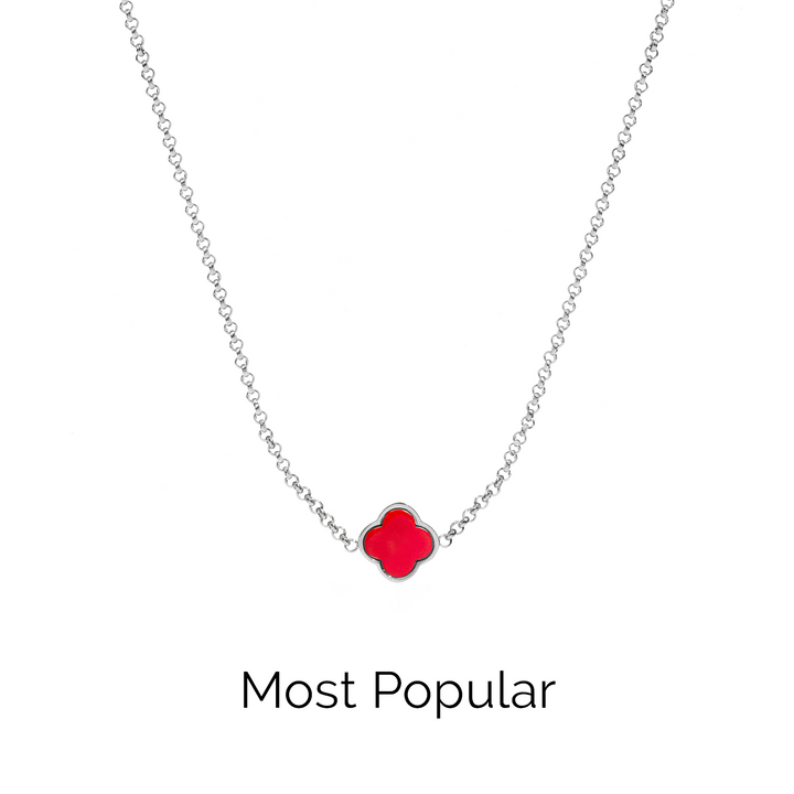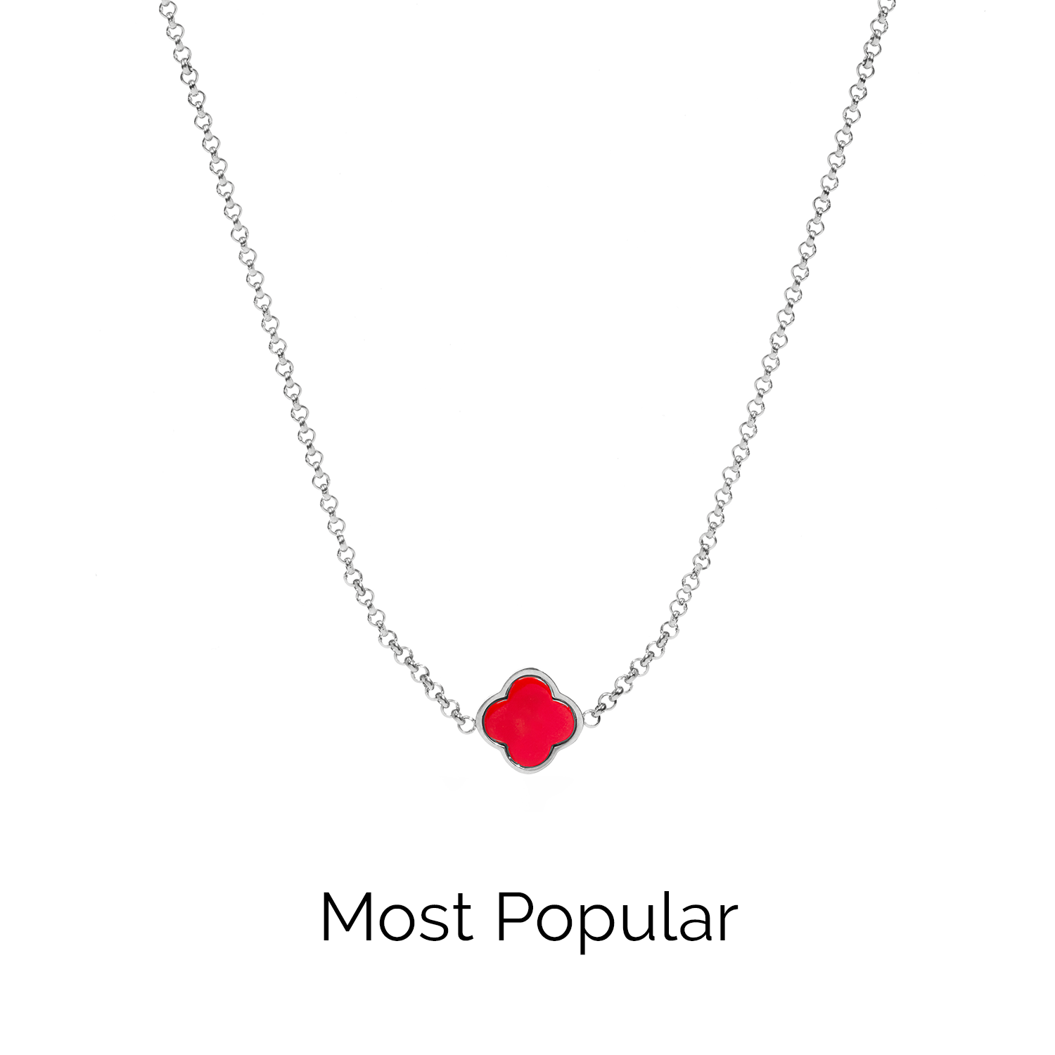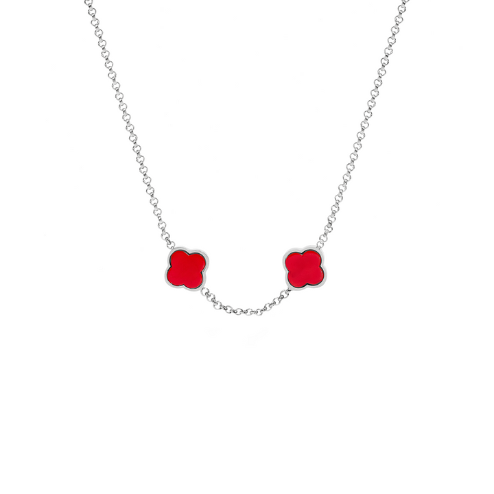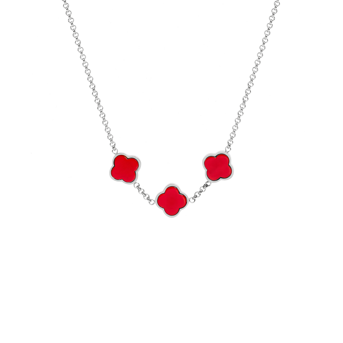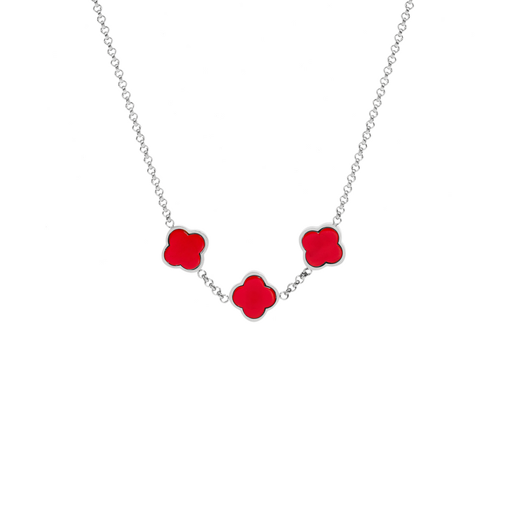 Handcrafted in silver-plated stainless steel with red glass clovers. It is available in three chain lengths: 14-16in, 16-18in, and 18-20in.