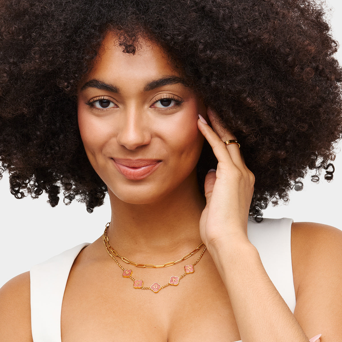 This Rose Quartz Clover Custom Name Necklace by Abbott Lyon is a designer-inspired clover necklace finished in beautiful rose quartz stone, which symbolizes self-love and friendship. You can complete it with the initials, birthstones, or icons of your choice to create a bespoke piece. Note that the natural stones may have slight color variations.