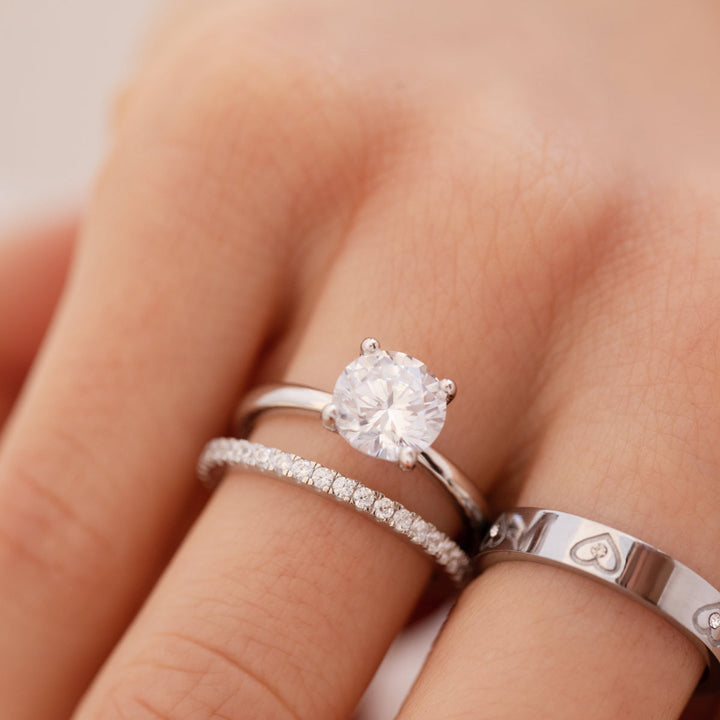 Handcrafted in rhodium-plated sterling silver with an 8mm round-cut stone, equivalent to 2 carats. It has a 4-claw setting and is available in six sizes: J, K, L, M, N, and P.