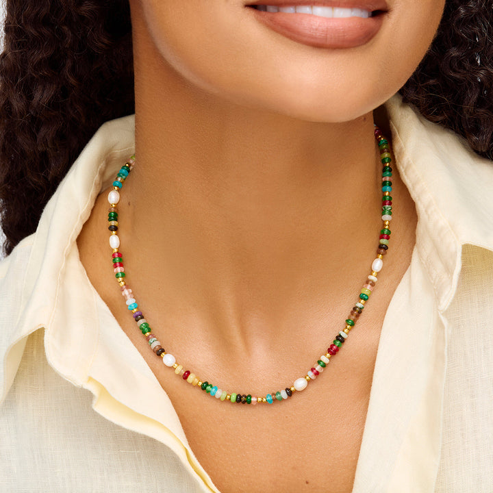 This Semi Precious Stone Necklace by Abbott Lyon is the pop of color your jewelry box has been waiting for. It is strung with a mix of semi-precious stones, including green onyx, red onyx, crystal quartz, rose quartz, amethyst, and pearl, each bringing its own energy. Set on a fine 18k gold-plated chain, it is an easy, beachy layer you can wear all year round.