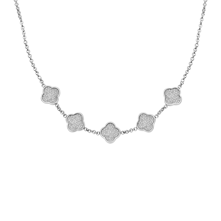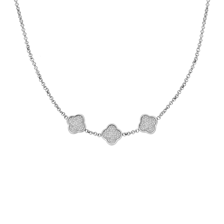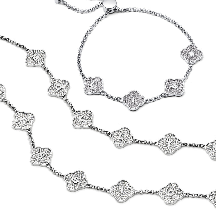 This Shimmer Pavé Clover Necklace by Abbott Lyon is a silver necklace with glittering cubic zirconia gems that will help you take center stage. It adds shine to every outfit and glamour to evening dresses. You can choose up to ten clover charms—either plain, letters from A to Z, a heart icon, or a clover icon—for a unique twist. It's the perfect gift for a special friend.