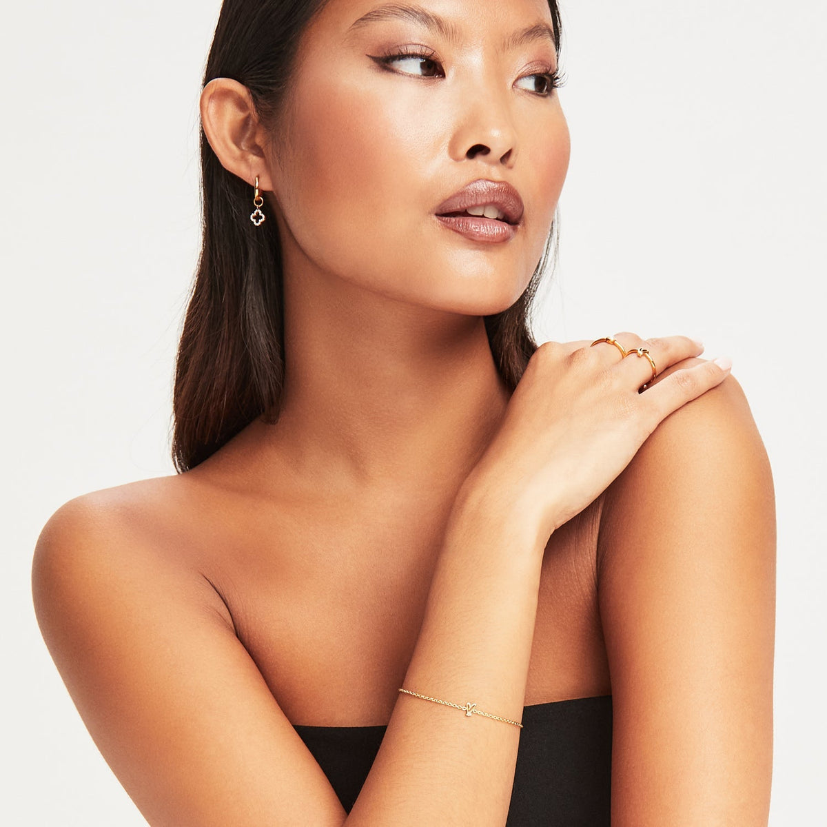 18k gold plated stainless steel with cubic zirconia. Adjustable chain length up to 8 in. Made with over 60% recycled materials.