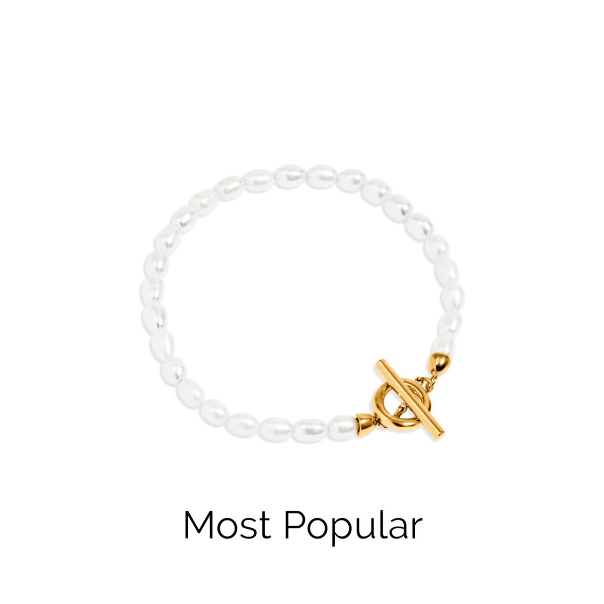 18k gold plated stainless steel with freshwater pearls. Sizes S/M (7.5 in) and M/L (8.5 in). Made with over 60% recycled materials.