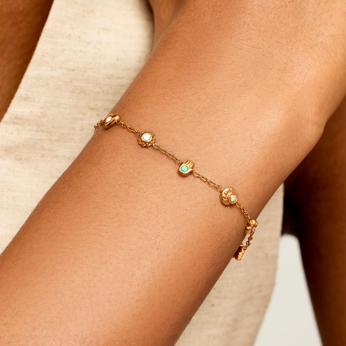 18k gold plated stainless steel with Preciosa stones. Size adjustable 7–9 in. Features eight talisman charms: clover with emerald, crescent moon with crystal, evil eye with sapphire, hamsa with turquoise, heart with rose opal, horseshoe with crystal, north star with amethyst, sun with white opal. Made with over 60% recycled materials.