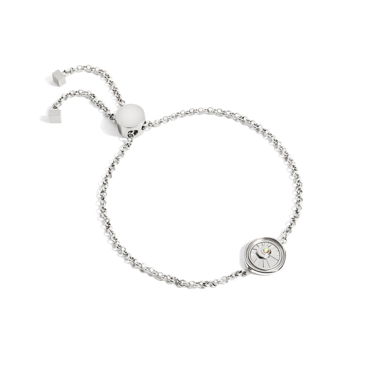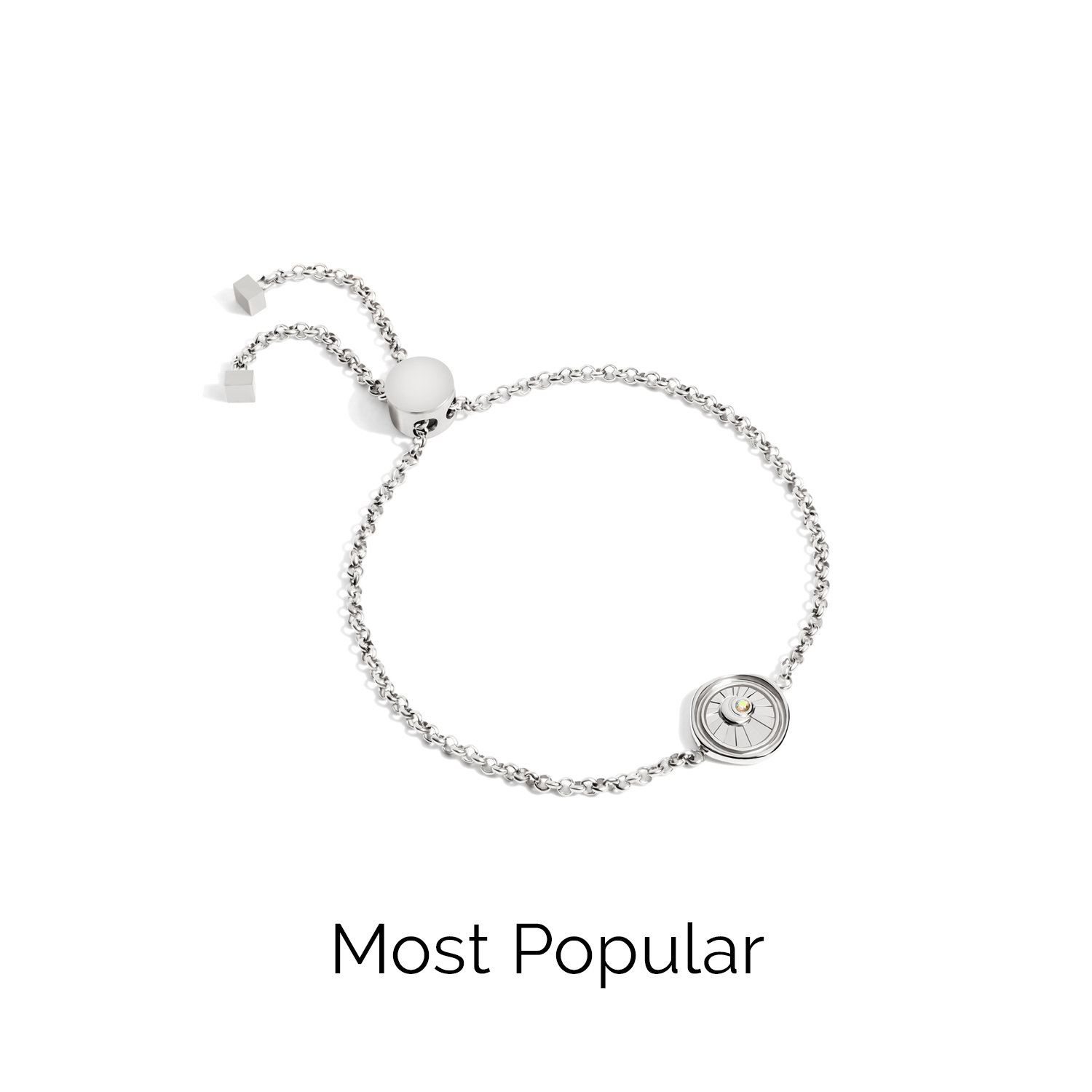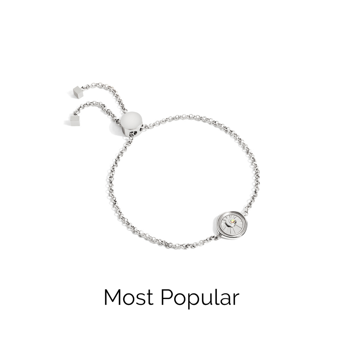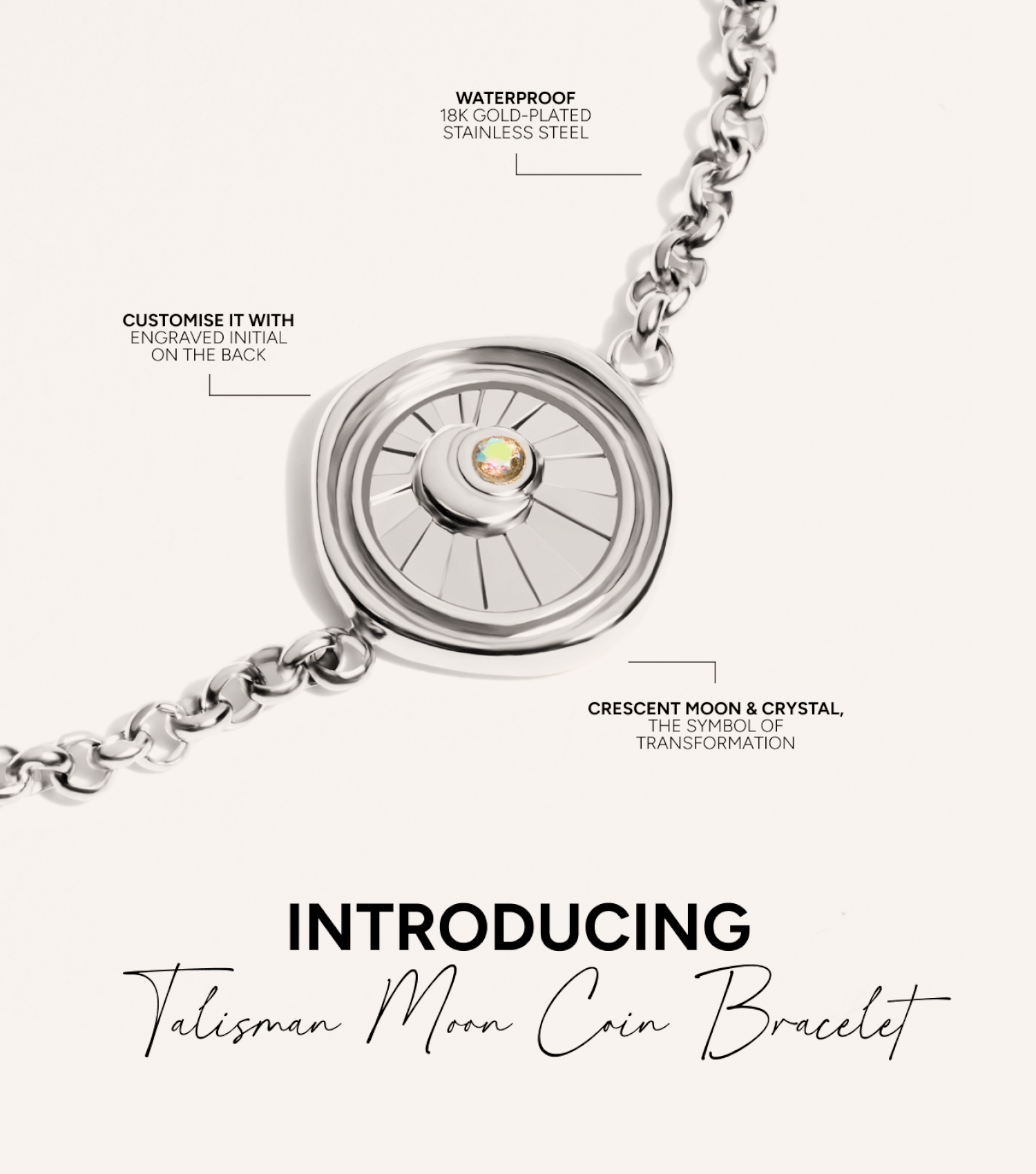 This Talisman Moon Coin Bracelet in silver by Abbott Lyon offers the same transformative moon motif in a cool, sleek finish. The engravable reverse adds a personal touch, making it an elegant keepsake for everyday intention-setting.