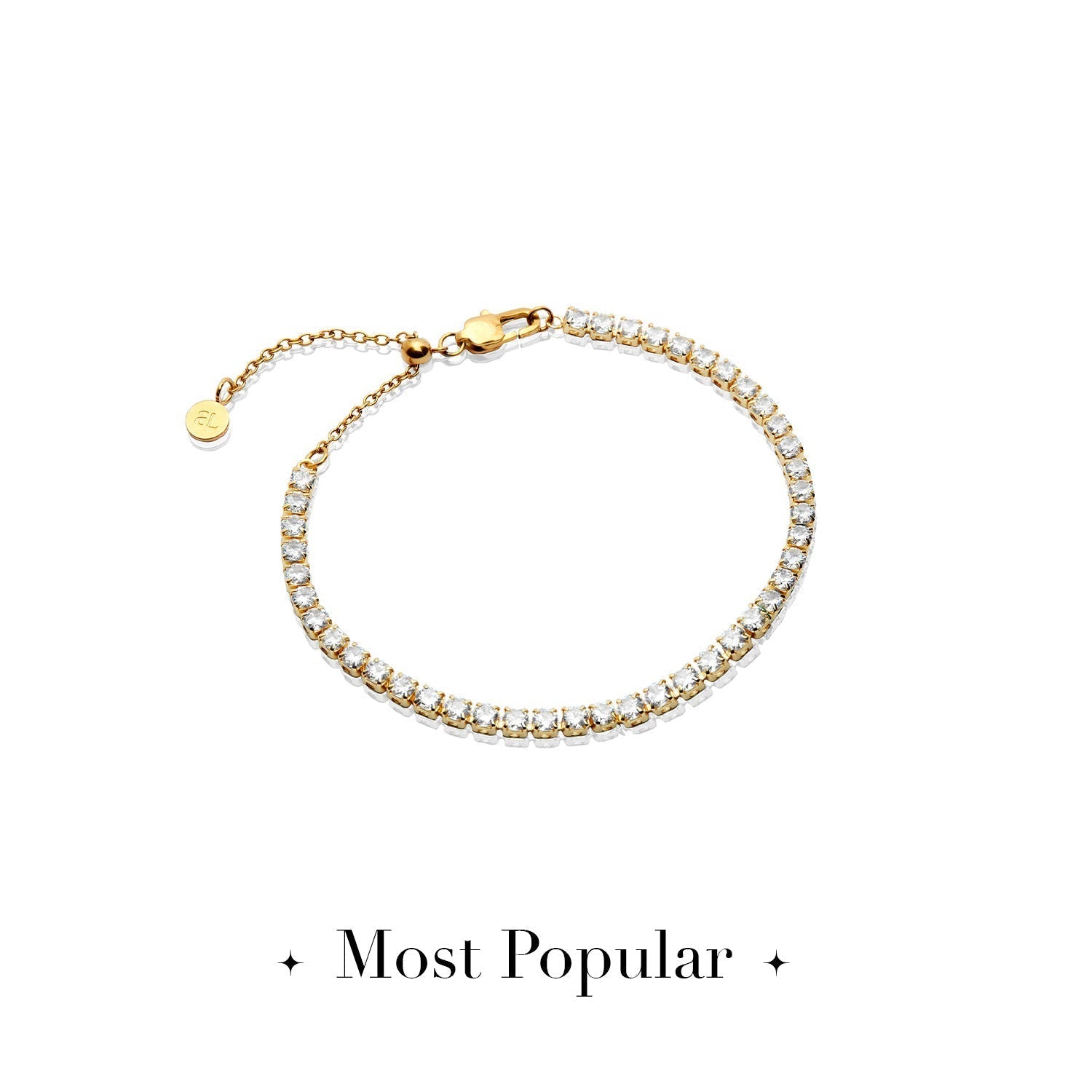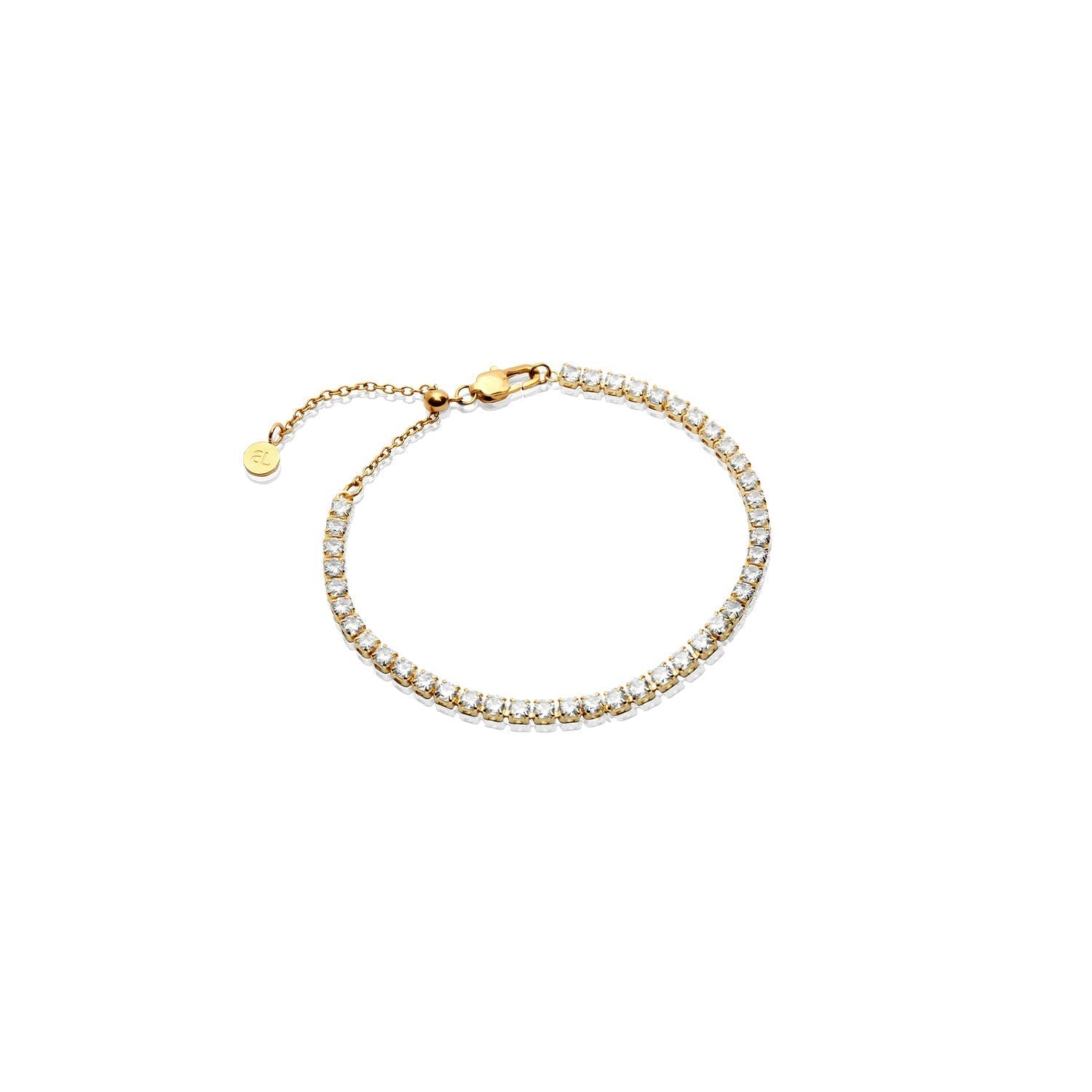 18k gold plated stainless steel with clear cubic zirconia. Thickness 4 mm. Chain lengths S/M 6–7.5 in, M/L 7–8.5 in. Anti-tarnish coating; water, sweat, and heat-resistant. Made with over 60% recycled materials.