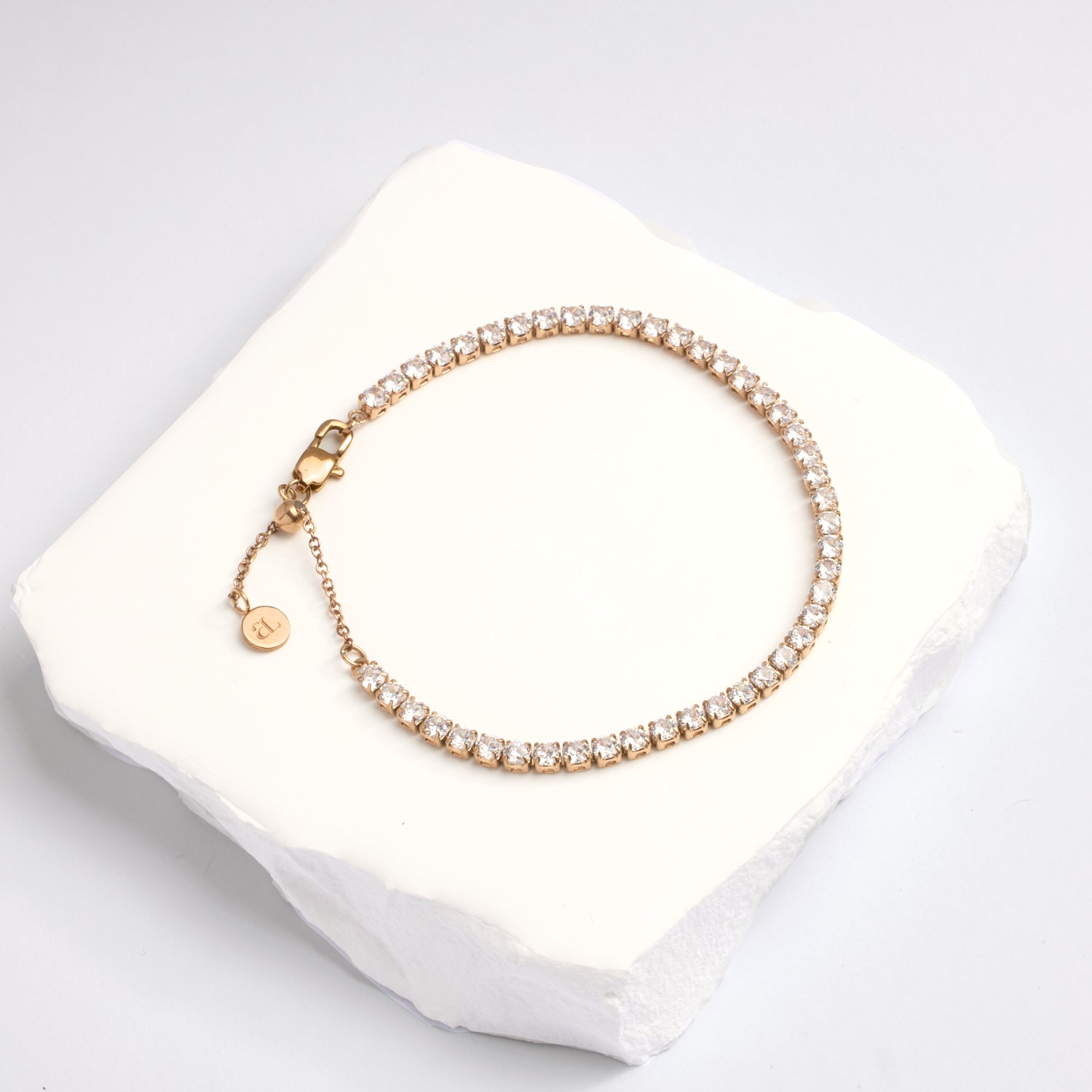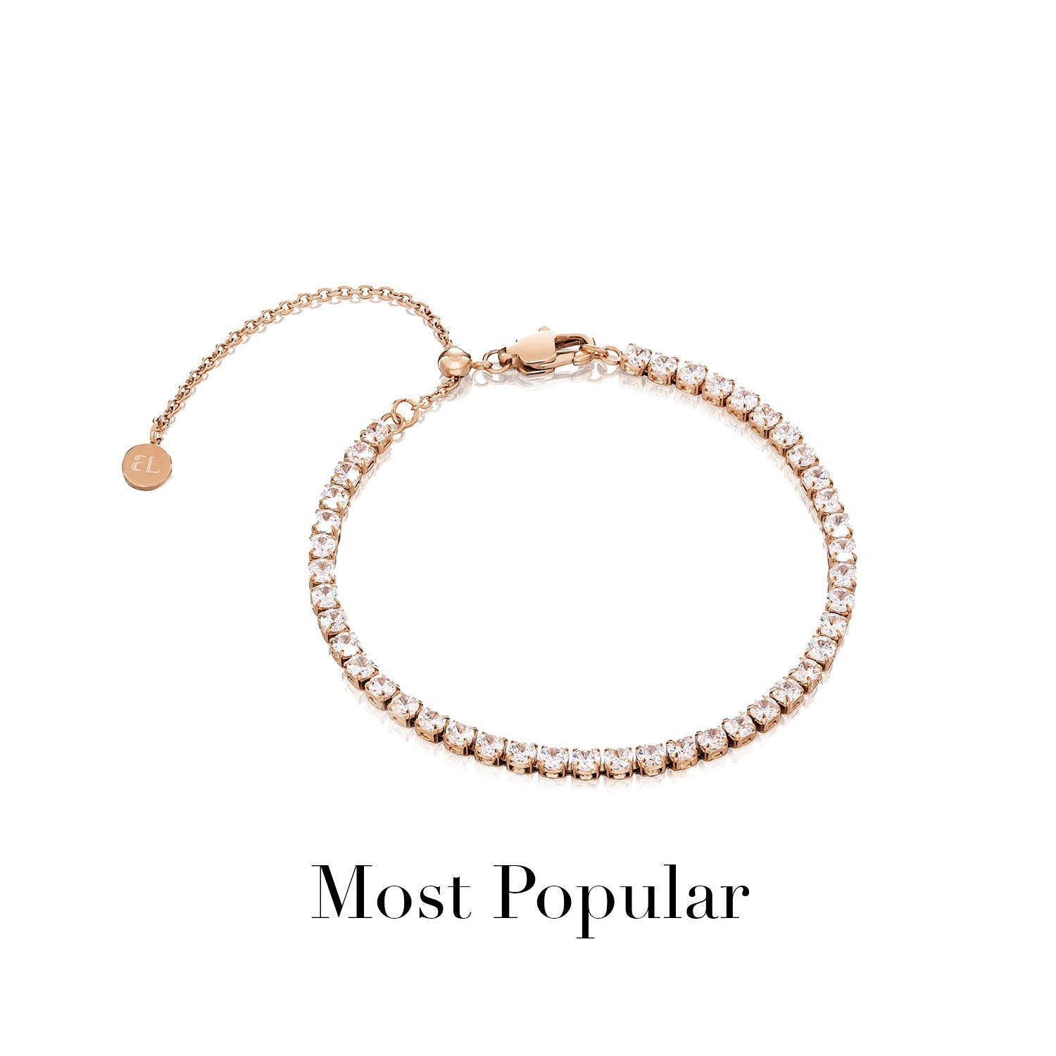 18k rose gold plated stainless steel with clear cubic zirconia. Thickness 4 mm. Chain lengths S/M 6–7.5 in, M/L 7–8.5 in. Anti-tarnish coating; water, sweat, and heat-resistant. Made with over 60% recycled materials.