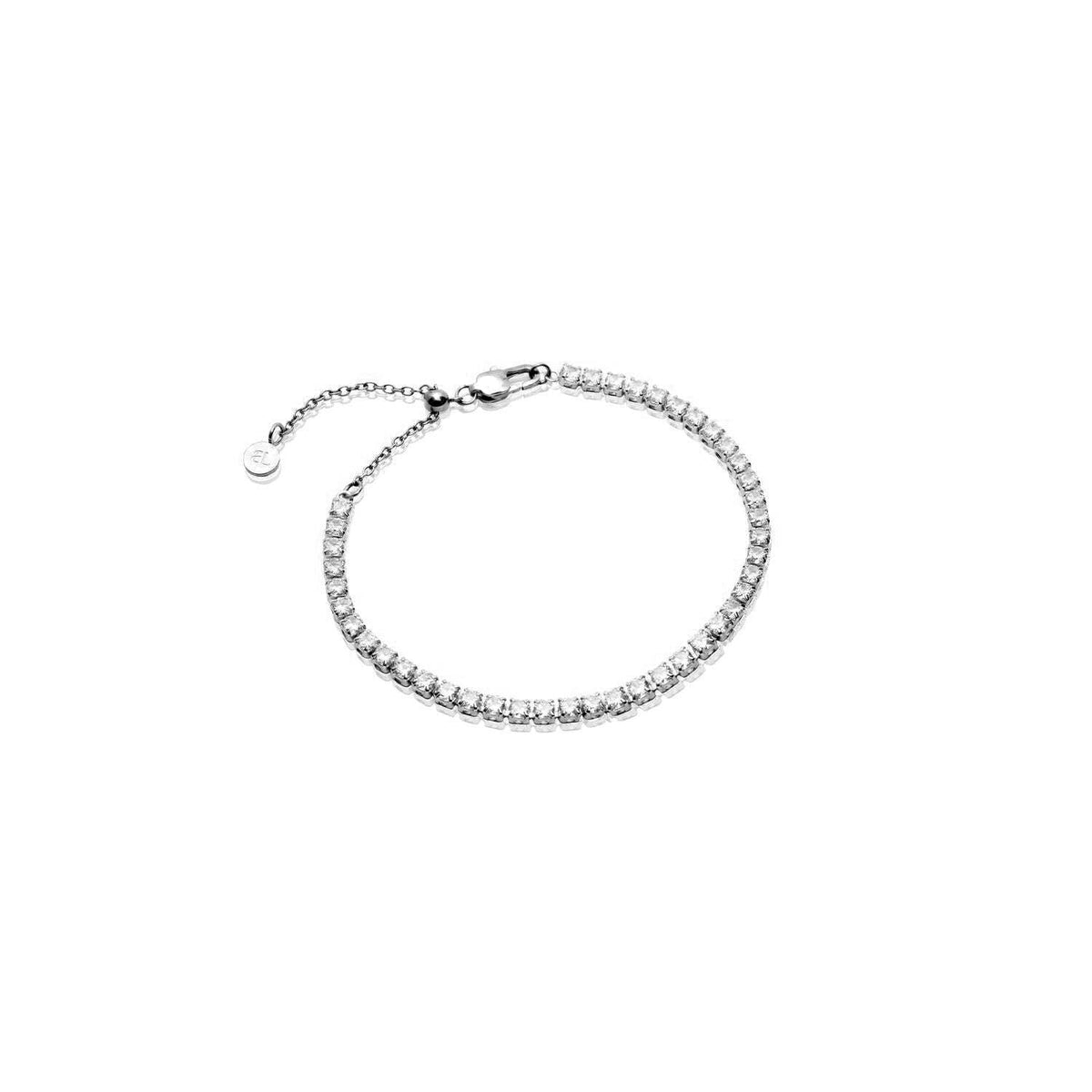 Polished stainless steel with clear cubic zirconia. Adjustable 6–8.5 in. Thickness 4 mm. Anti-tarnish coating; water, sweat, and heat-resistant. Made with over 60% recycled materials.