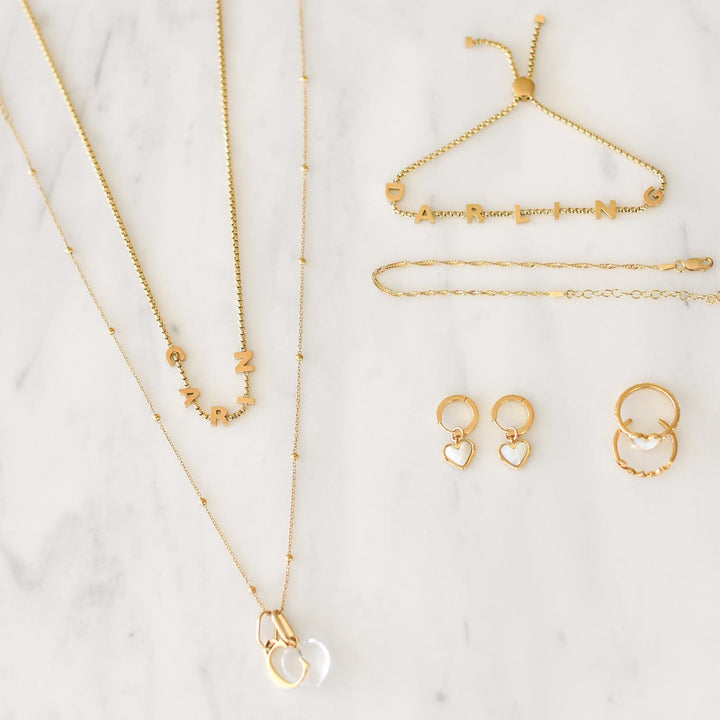 18k gold-plated brass with moonstone-effect quartz. Heart 9 × 9 mm. Water, sweat, and heat-resistant.
