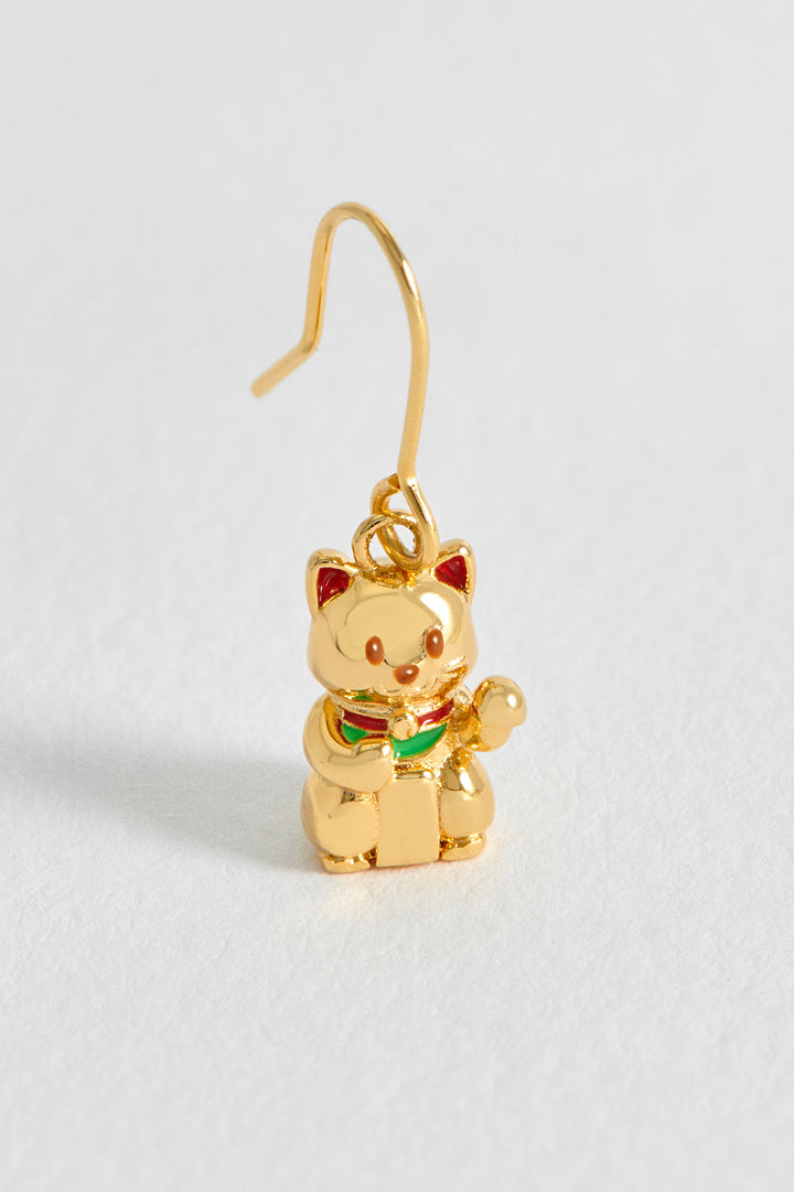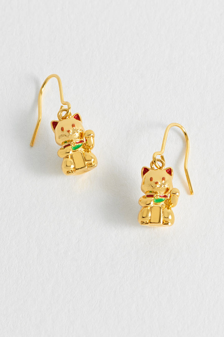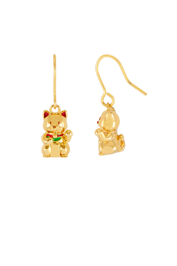 Crafted from gold-plated metal, these earrings feature detailed lucky cat charms. Each earring measures about 22mm in length, with the charm measuring approximately 11x6mm.