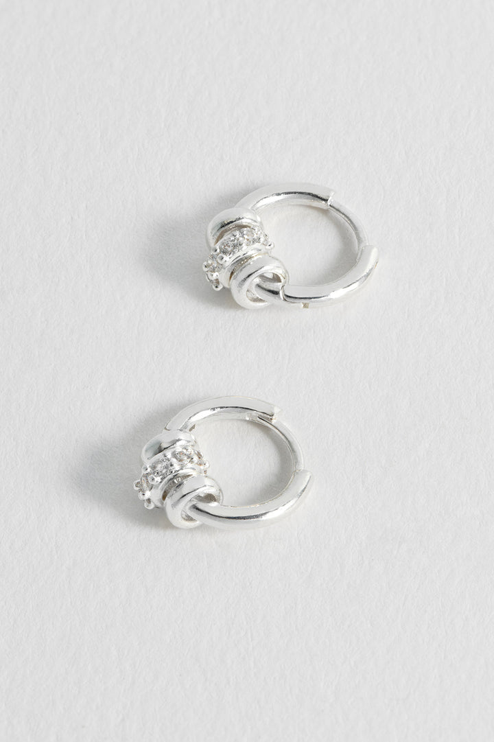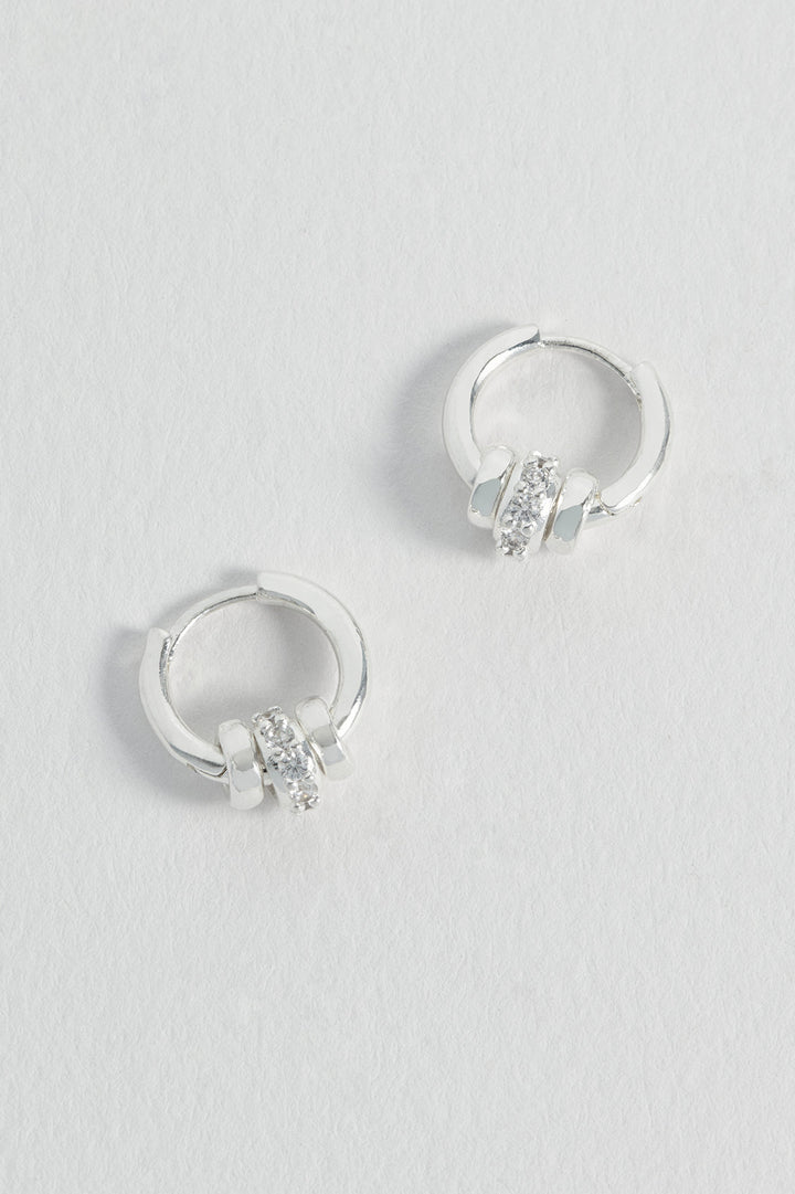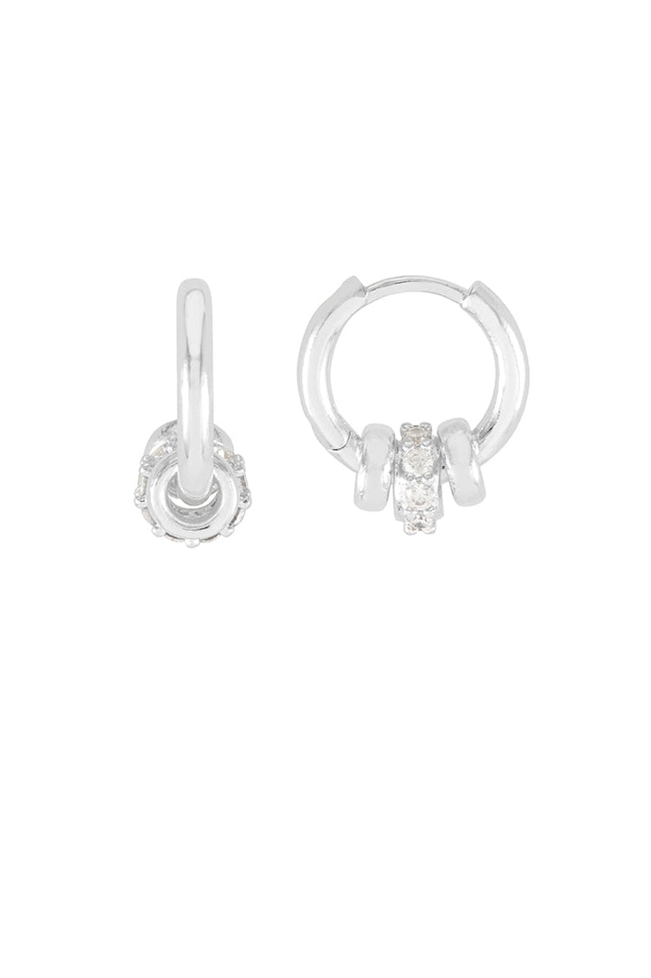 Crafted from silver-plated metal, these huggie hoops feature three removable disc charms, one with cubic zirconia stones. Each hoop measures approximately 11mm.