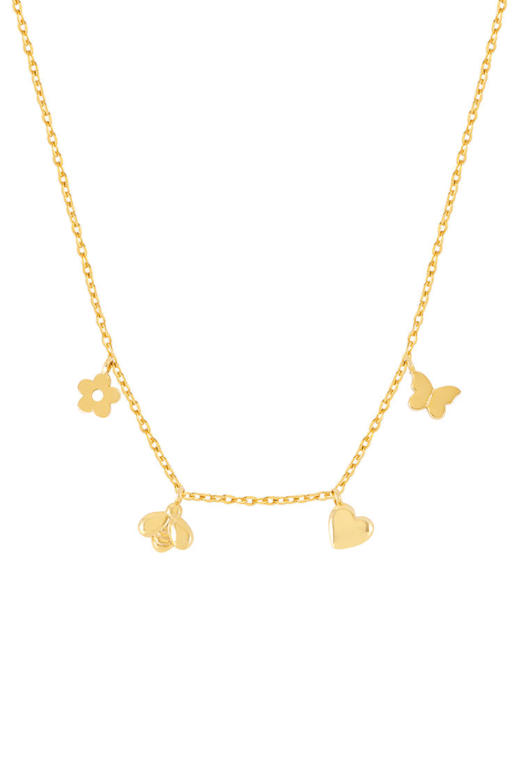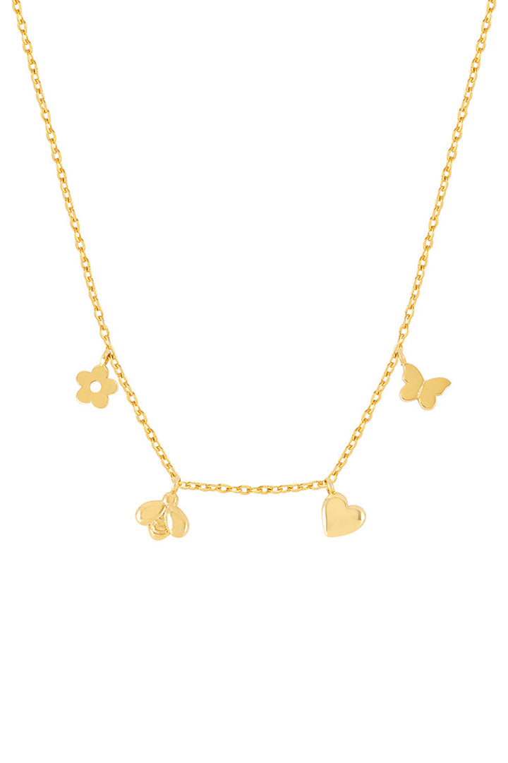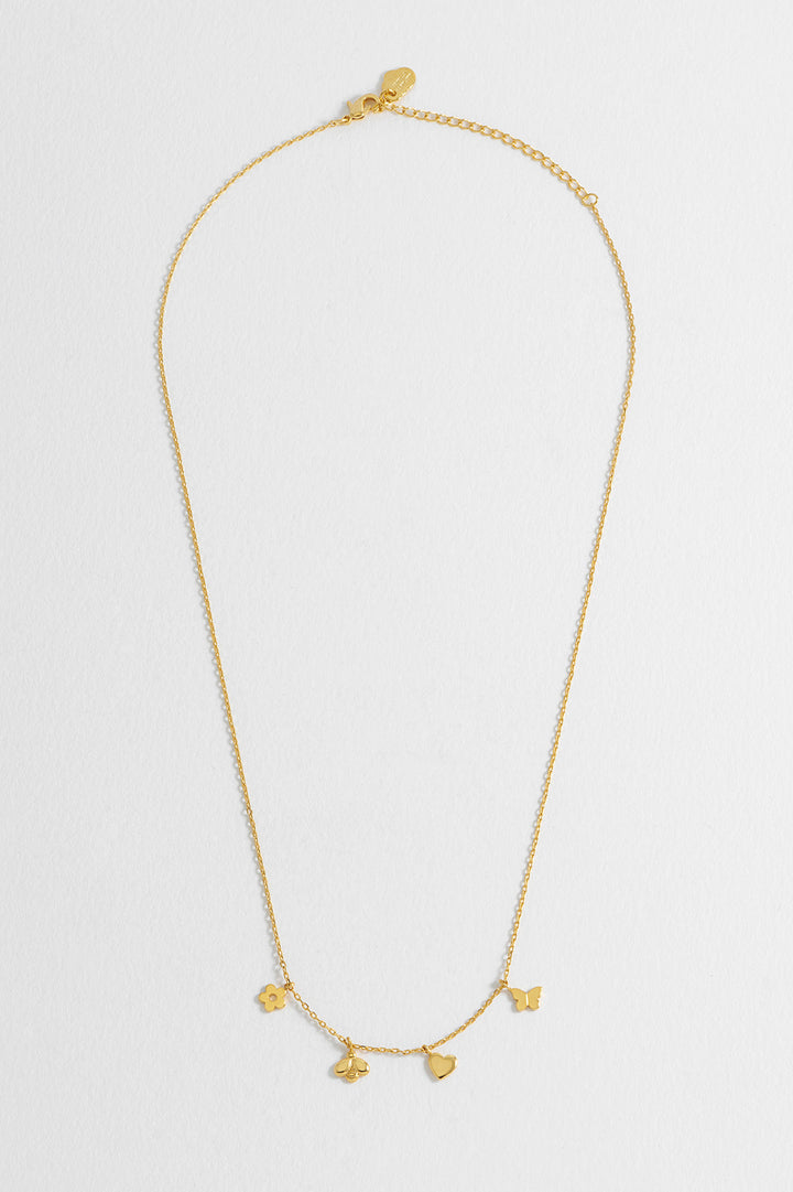 This Bee and Butterfly Charm Necklace by Estella Bartlett is a whimsical and nature-inspired piece. The delicate chain is adorned with a charming collection of small charms, including a bee, butterfly, flower, and heart. This necklace captures a playful bohemian aesthetic and is perfect for adding a touch of natural beauty to your everyday style.