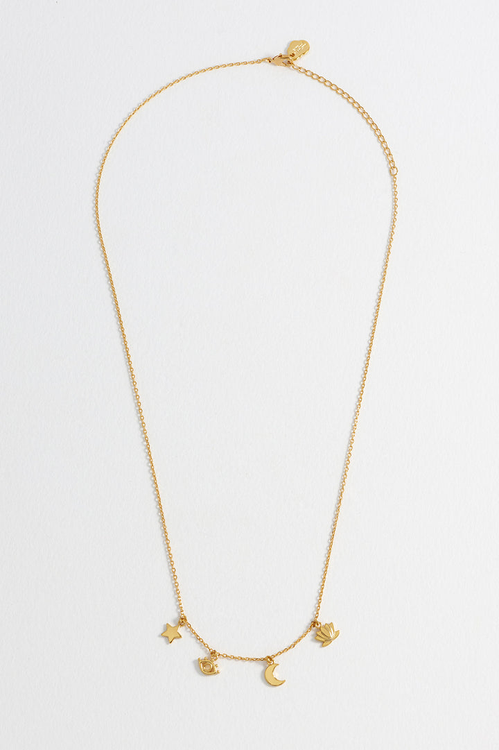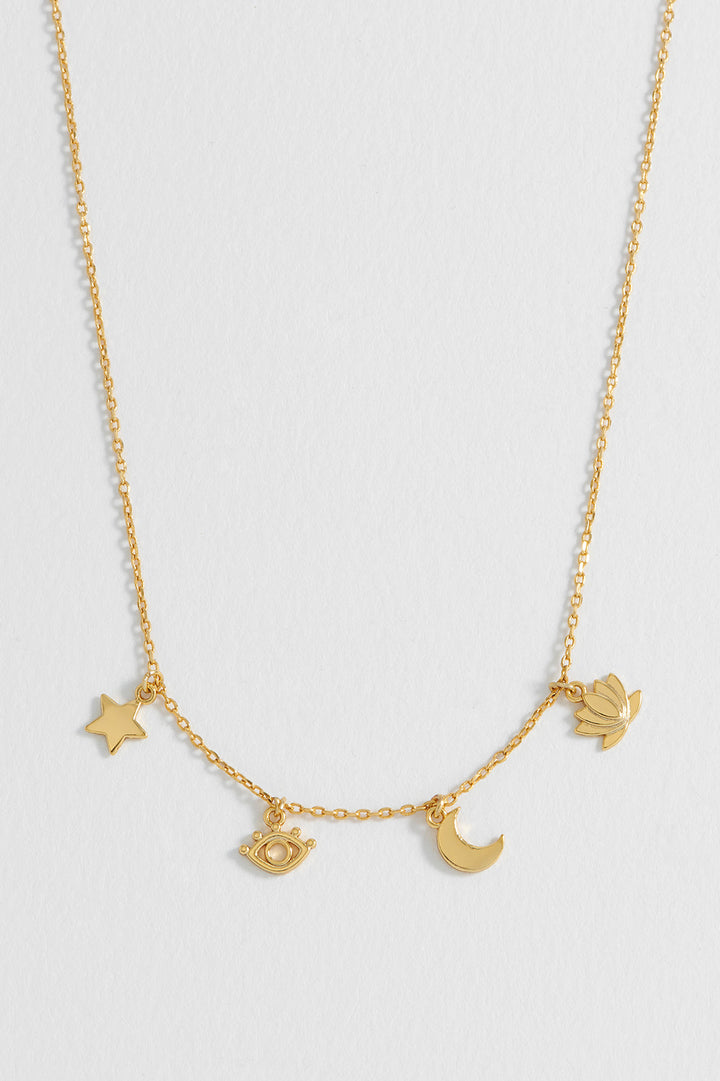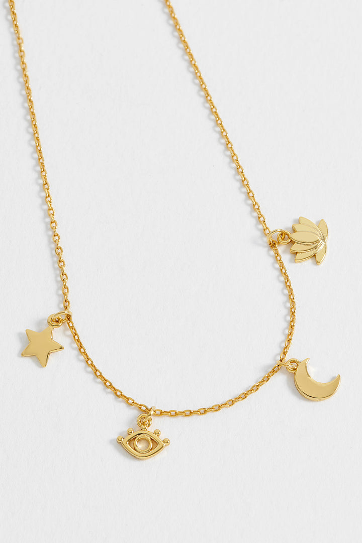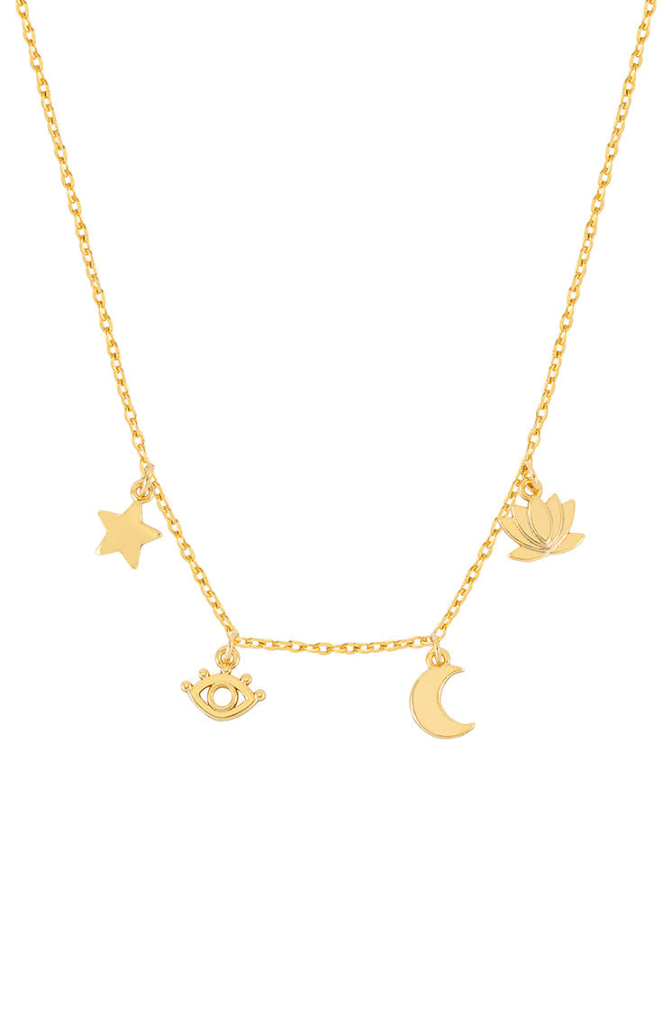 Crafted from gold-plated metal, this necklace features star, evil eye, moon, and lotus charms. The chain measures 41-46cm and each charm measures approximately 6x6mm.