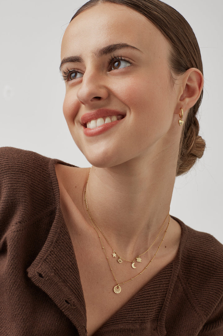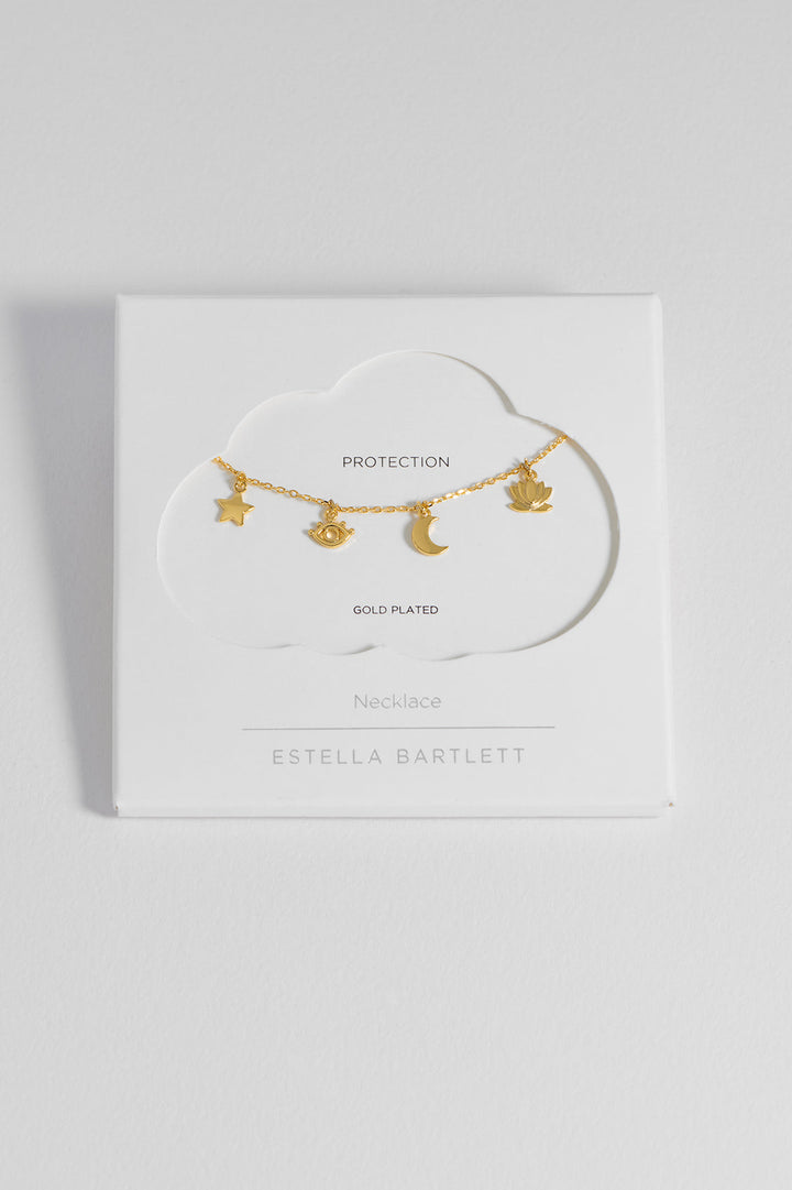 This Boho Charm Necklace by Estella Bartlett is a bohemian and meaningful piece designed to protect your energy and bring good vibes. The delicate chain is adorned with an eclectic mix of symbolic charms, including a star, evil eye, moon, and lotus. This necklace is a perfect way to express your free-spirited style and positive intentions.