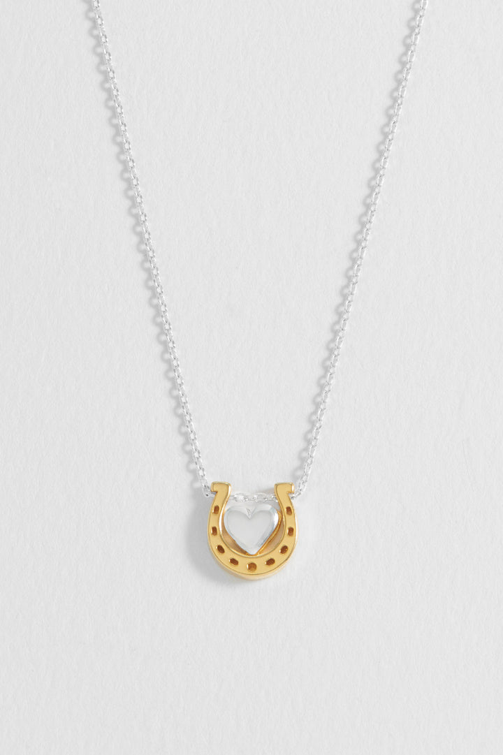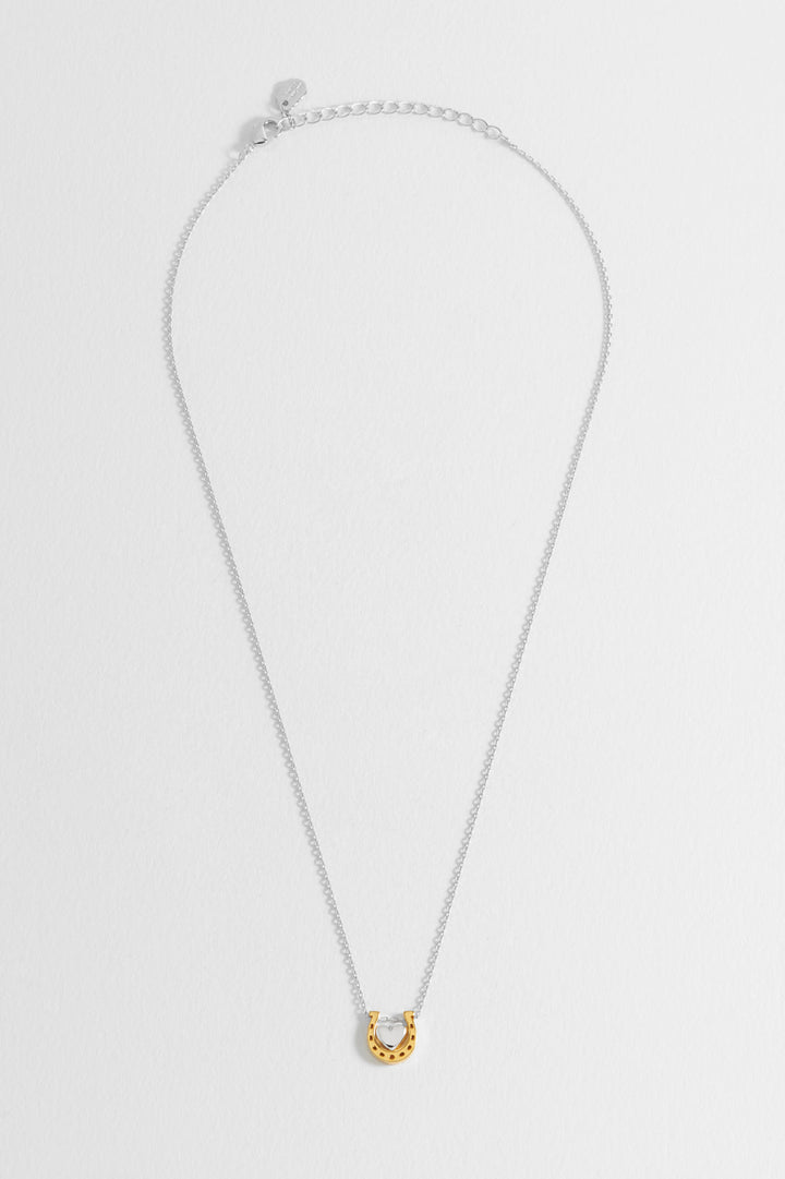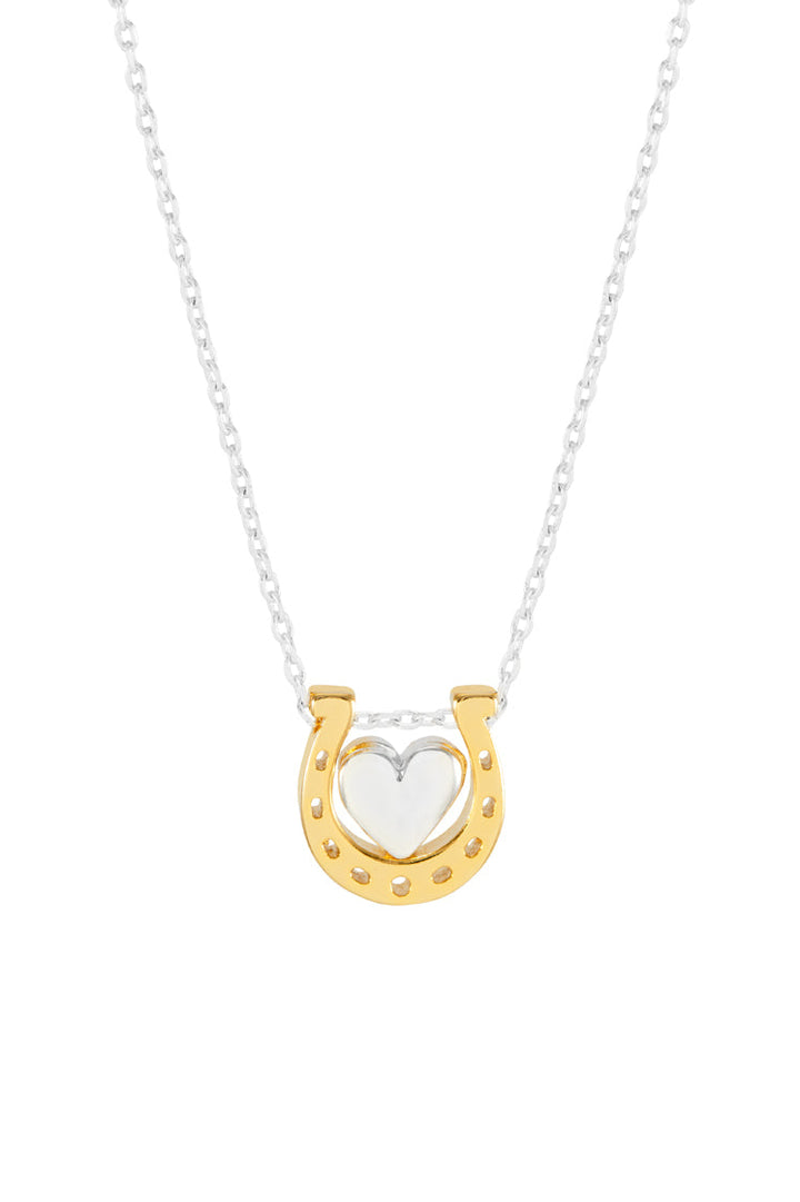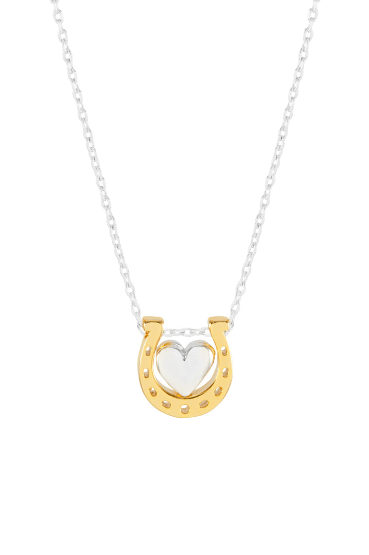 This necklace features a silver-plated heart charm and a gold-plated horseshoe charm on a silver-plated chain. The chain measures 41-46cm and the charm is approximately 10x10mm.