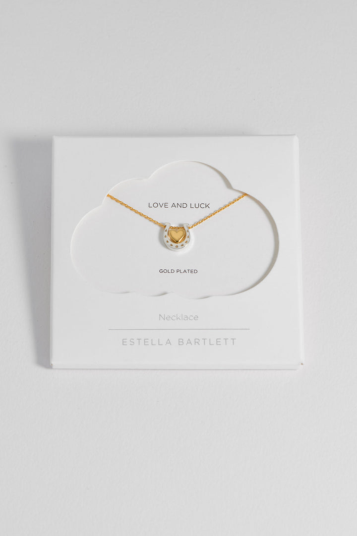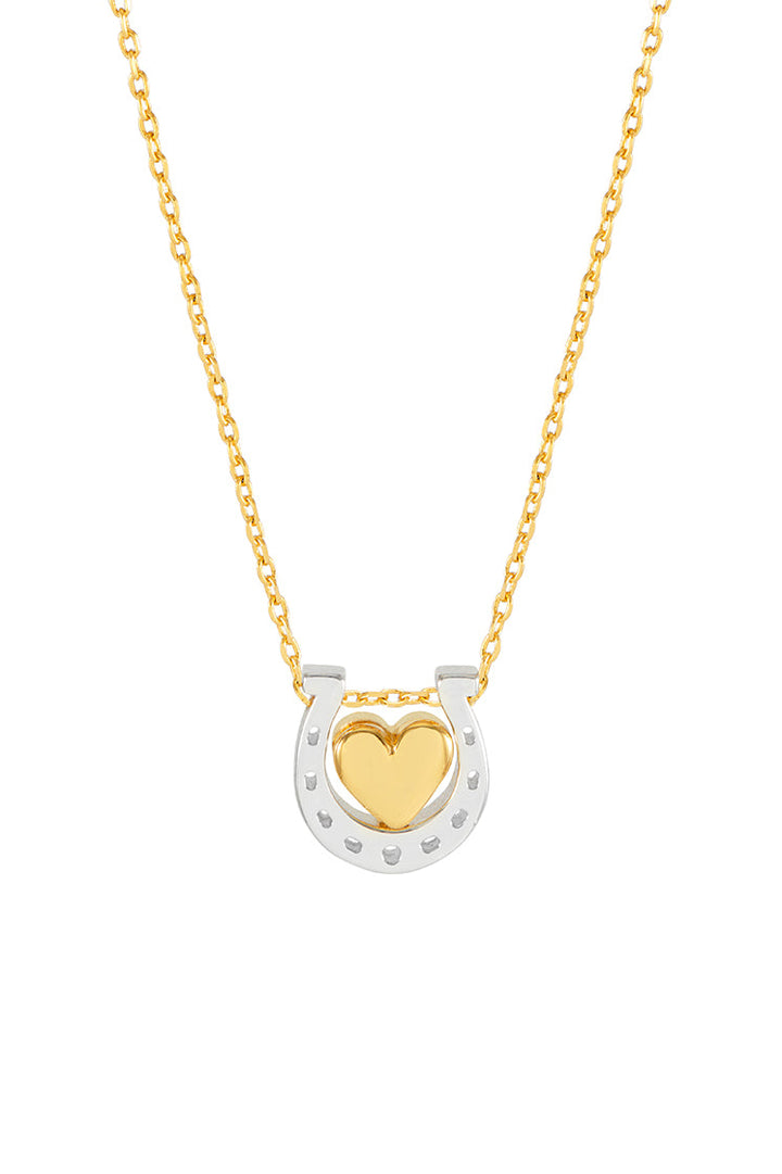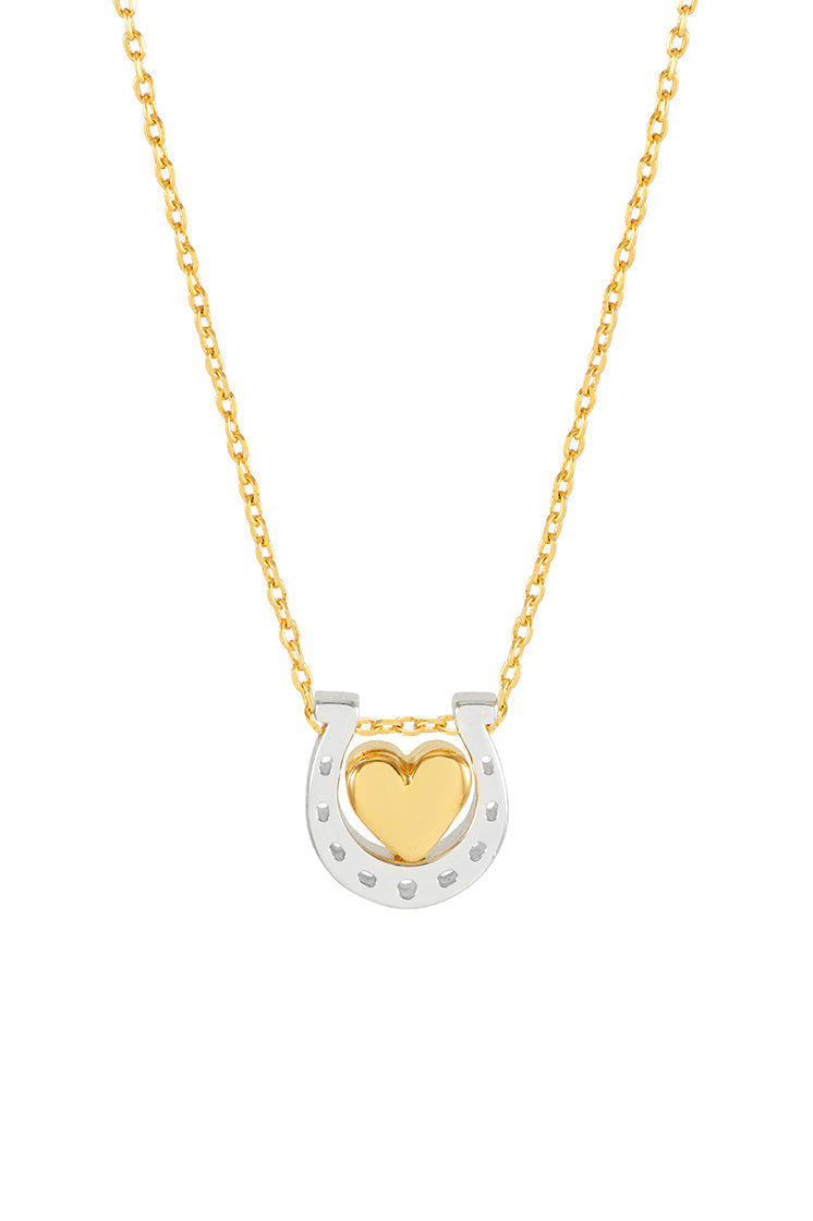 This necklace features a gold-plated heart charm and a silver-plated horseshoe charm on a gold-plated chain. The chain measures 41-46cm and the charm is approximately 10x10mm.