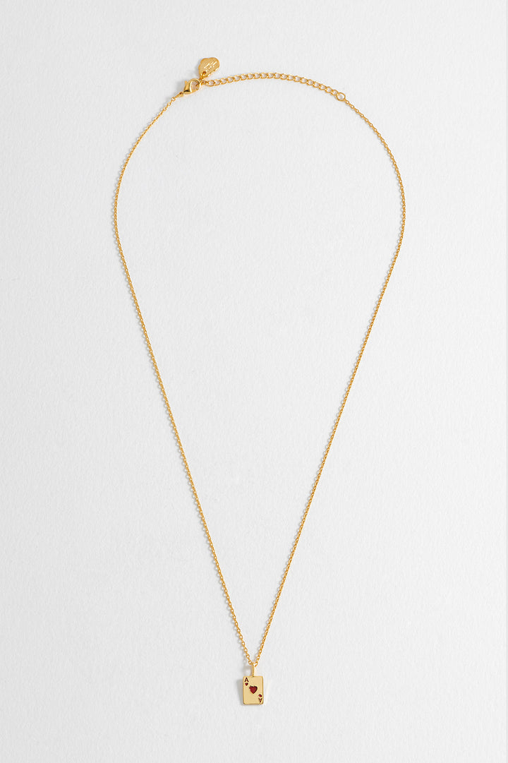 This necklace is crafted with a gold-plated finish and features an ace of hearts charm. The chain measures 41-46cm and the charm is approximately 8x6mm.