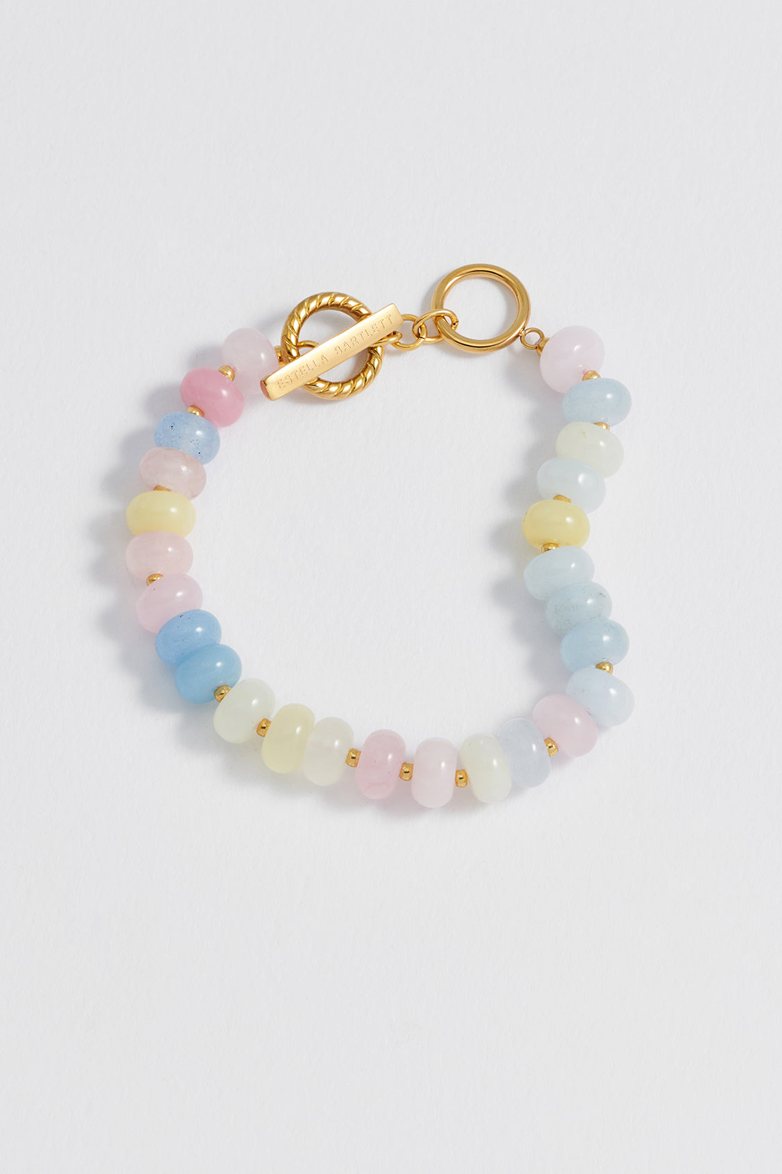 This Pastel Multi Gemstone T-Bar Bracelet by Estella Bartlett is a vibrant and modern piece. The chunky rondelle gemstone beads in soft pastel hues create a playful pop of color. The T-bar clasp adds a contemporary detail, elevating this piece to a stylish staple for any outfit.