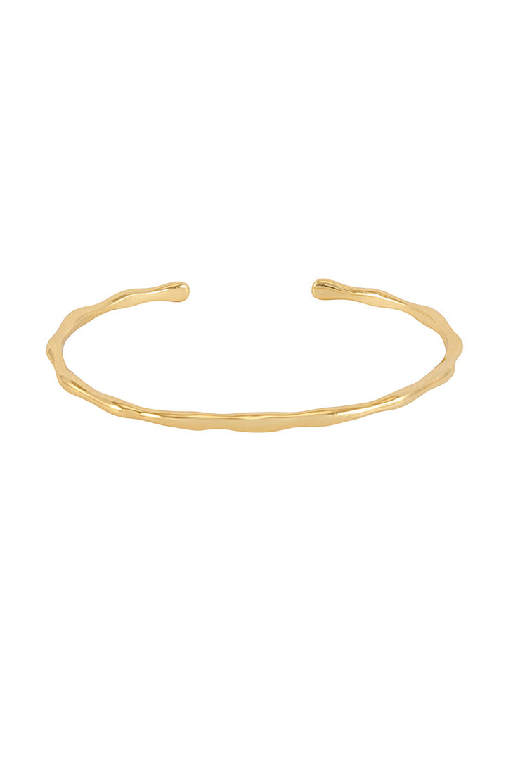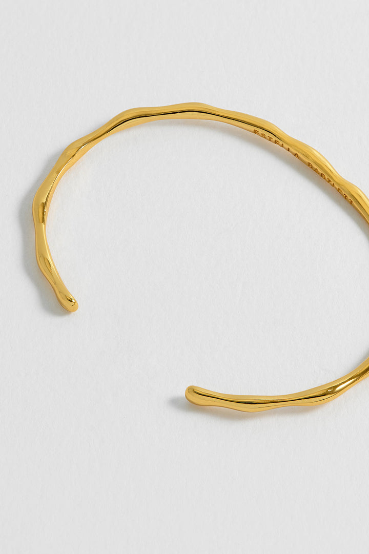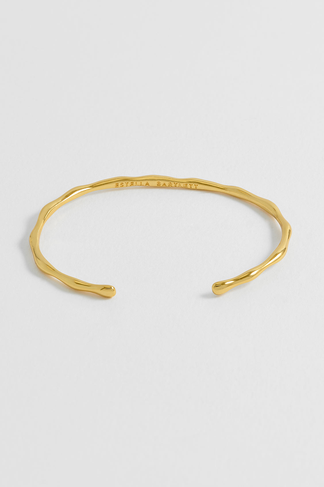 This Open Molten Bangle by Estella Bartlett is a bold and sculptural statement piece. The unique, textured design mimics the look of molten metal, giving it a raw and contemporary feel. The open silhouette ensures a comfortable fit and makes it a striking addition to any look. The high-quality PVD coating ensures a long-lasting, anti-tarnish, and waterproof finish.