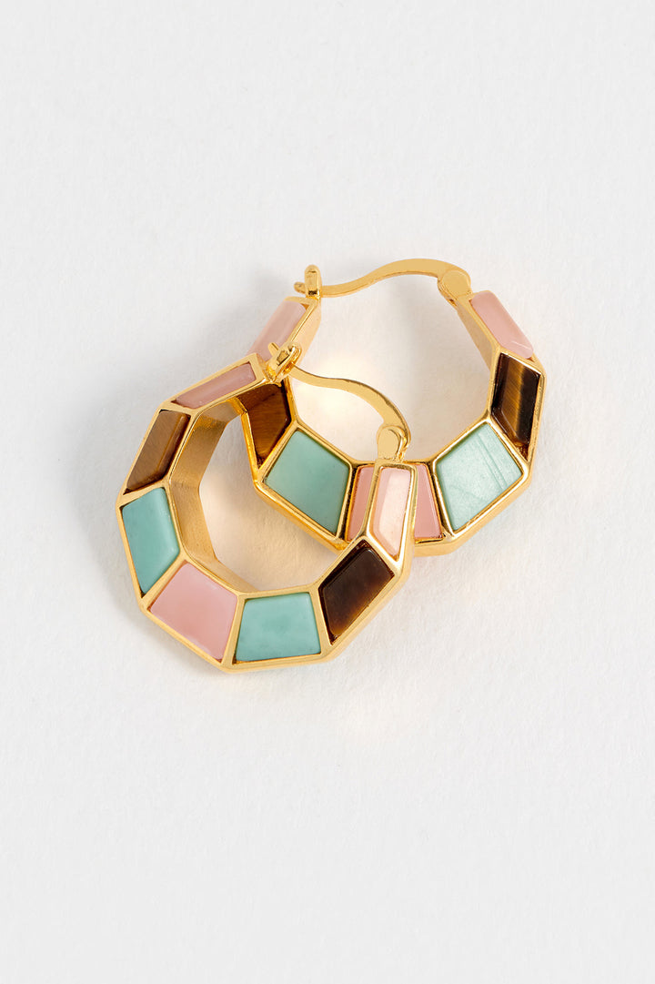 These Mixed Gemstone Octagon Hinge Hoop Earrings by Estella Bartlett are a modern and playful take on a classic hoop. The sleek octagonal shape is adorned with an array of vibrant natural gemstones, blending geometric elegance with a fun, colorful twist. The high-quality PVD coating ensures a long-lasting, anti-tarnish, and waterproof finish.